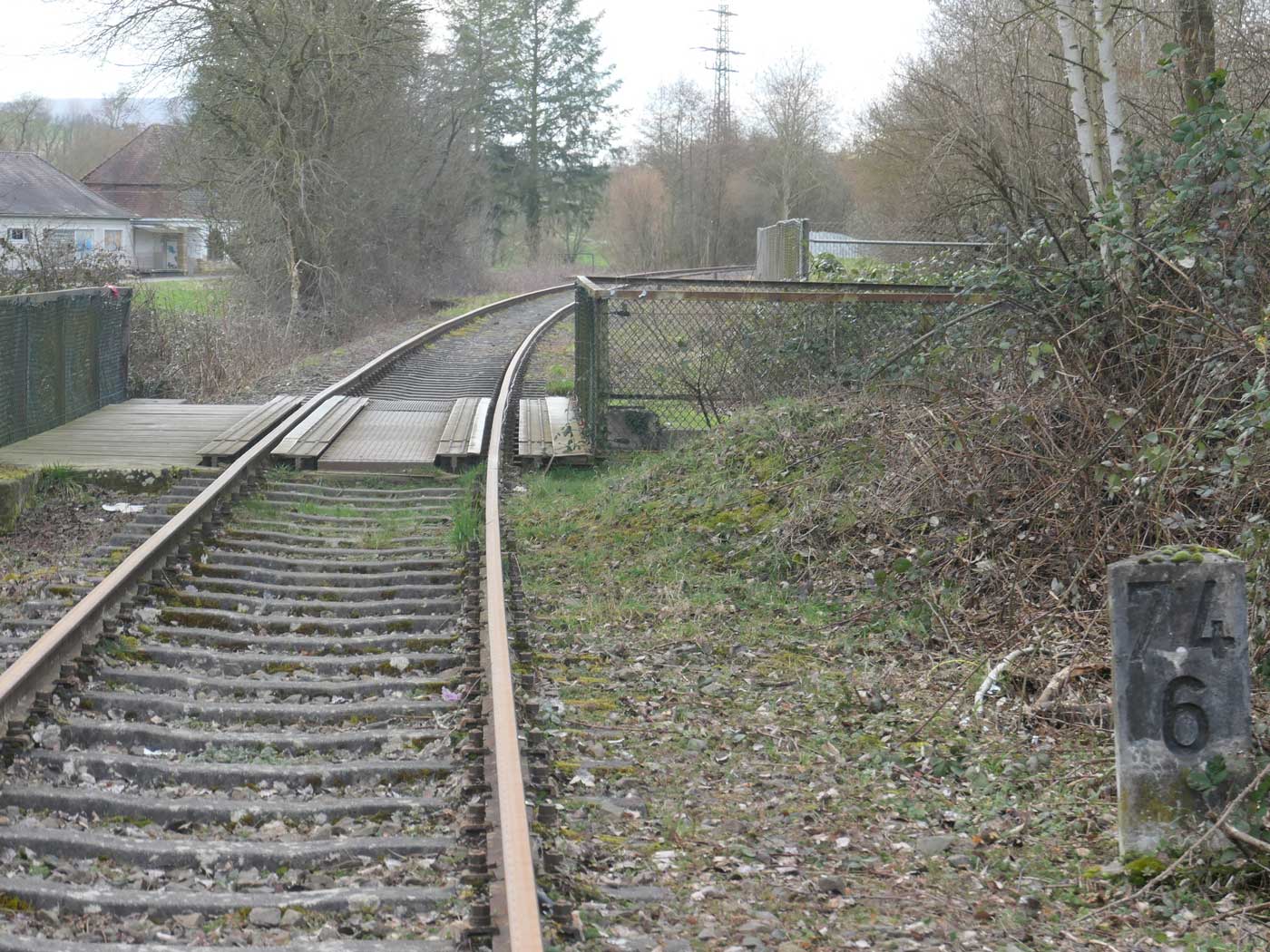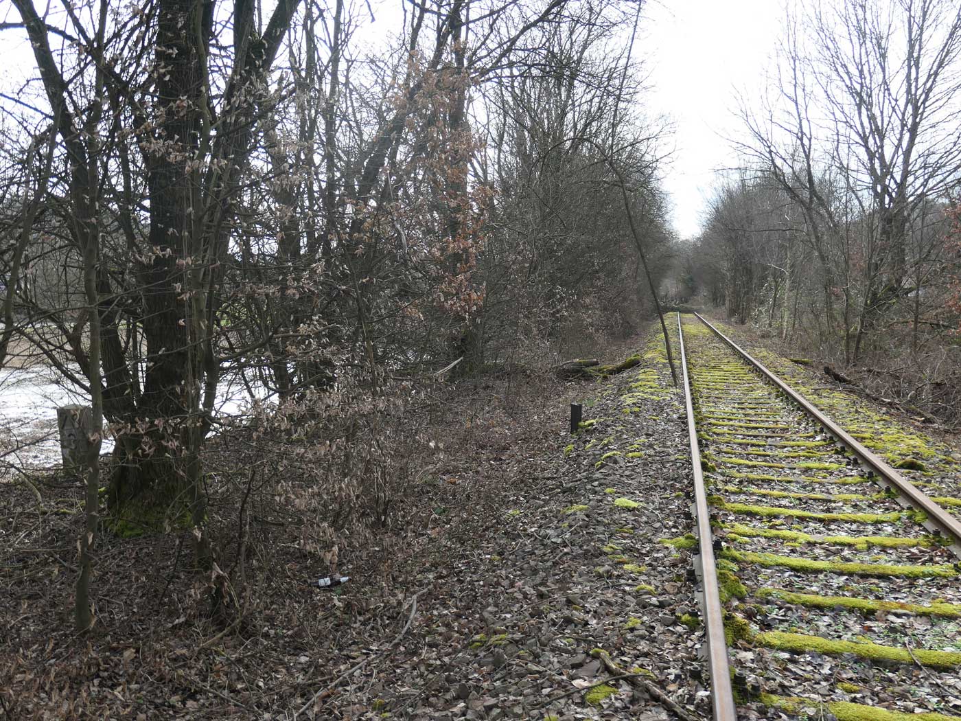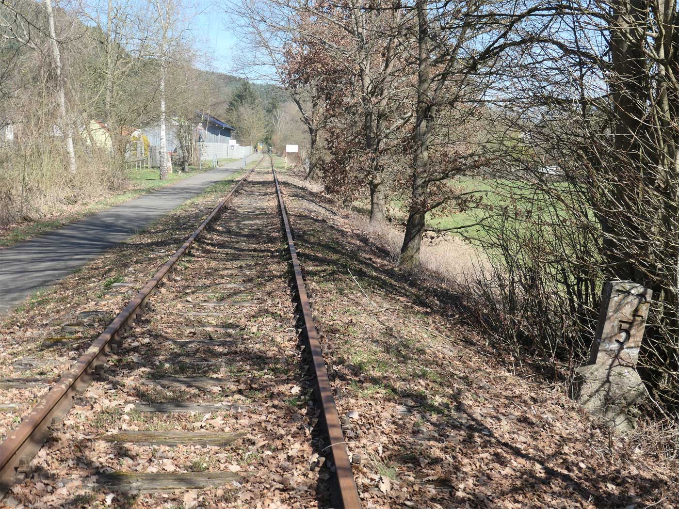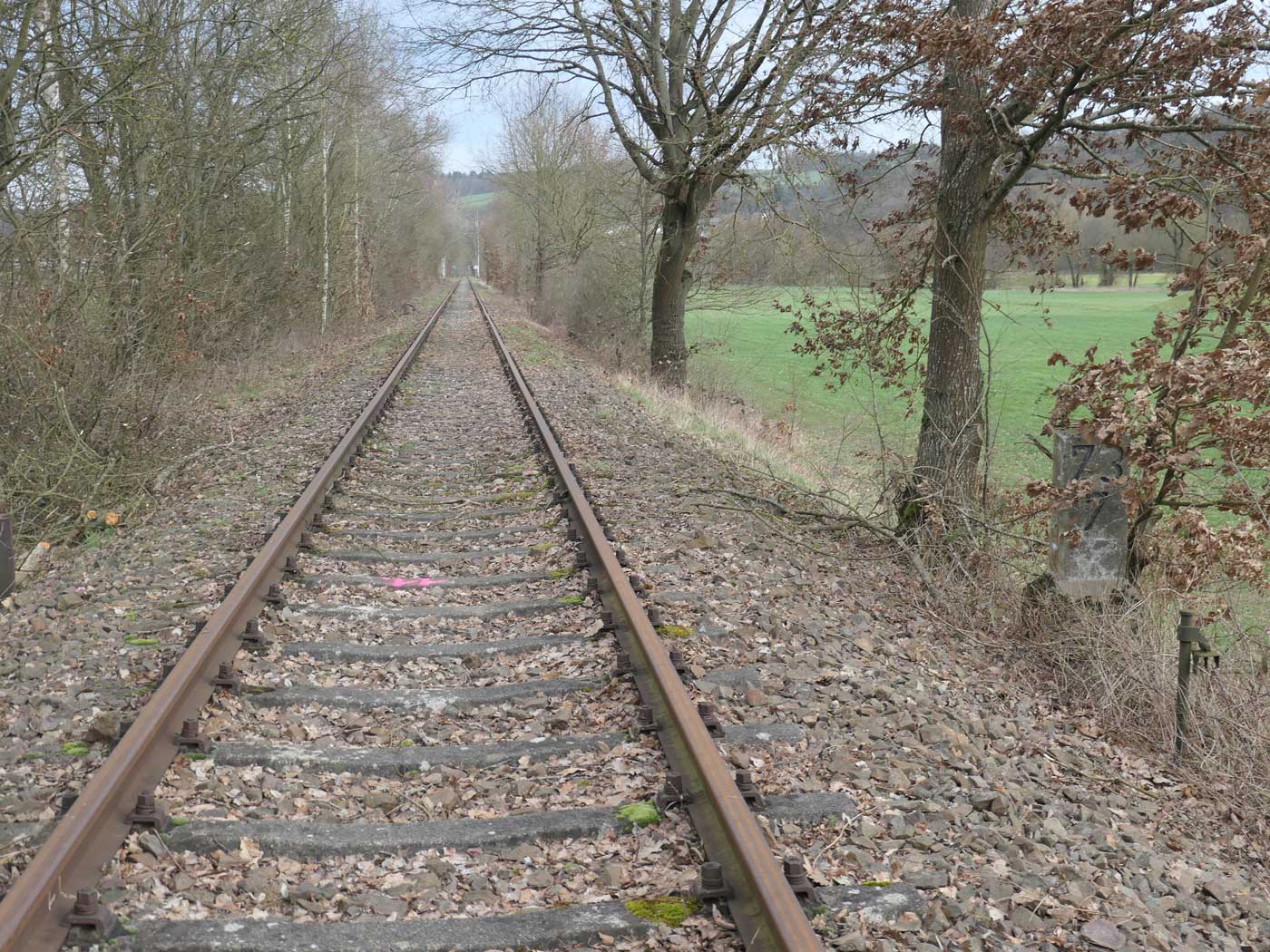 Rechts zwischen Gsp und Lampenmast am Zaun befindet sich km 34,4 der Strecke