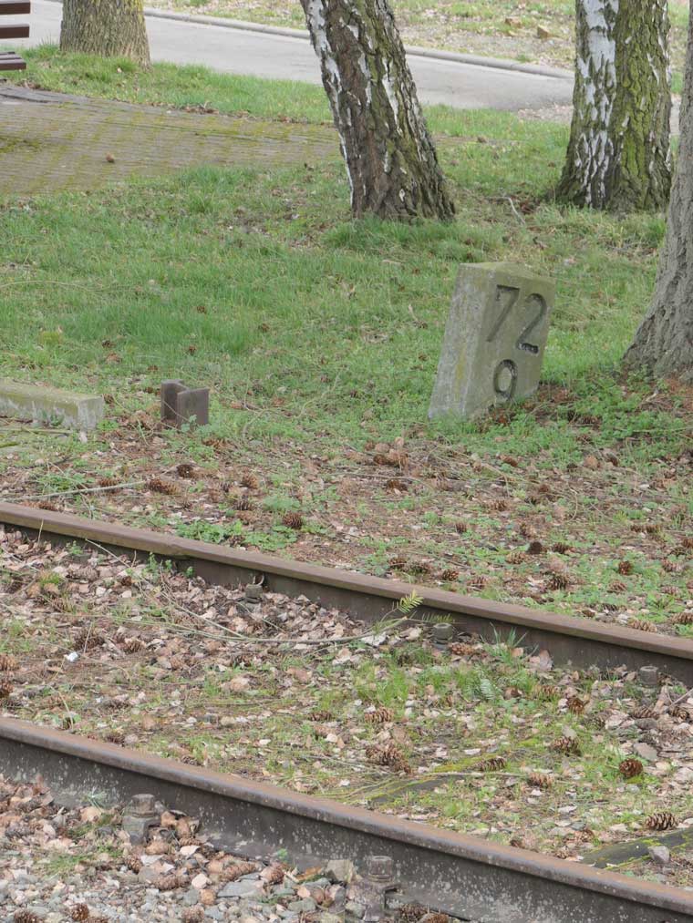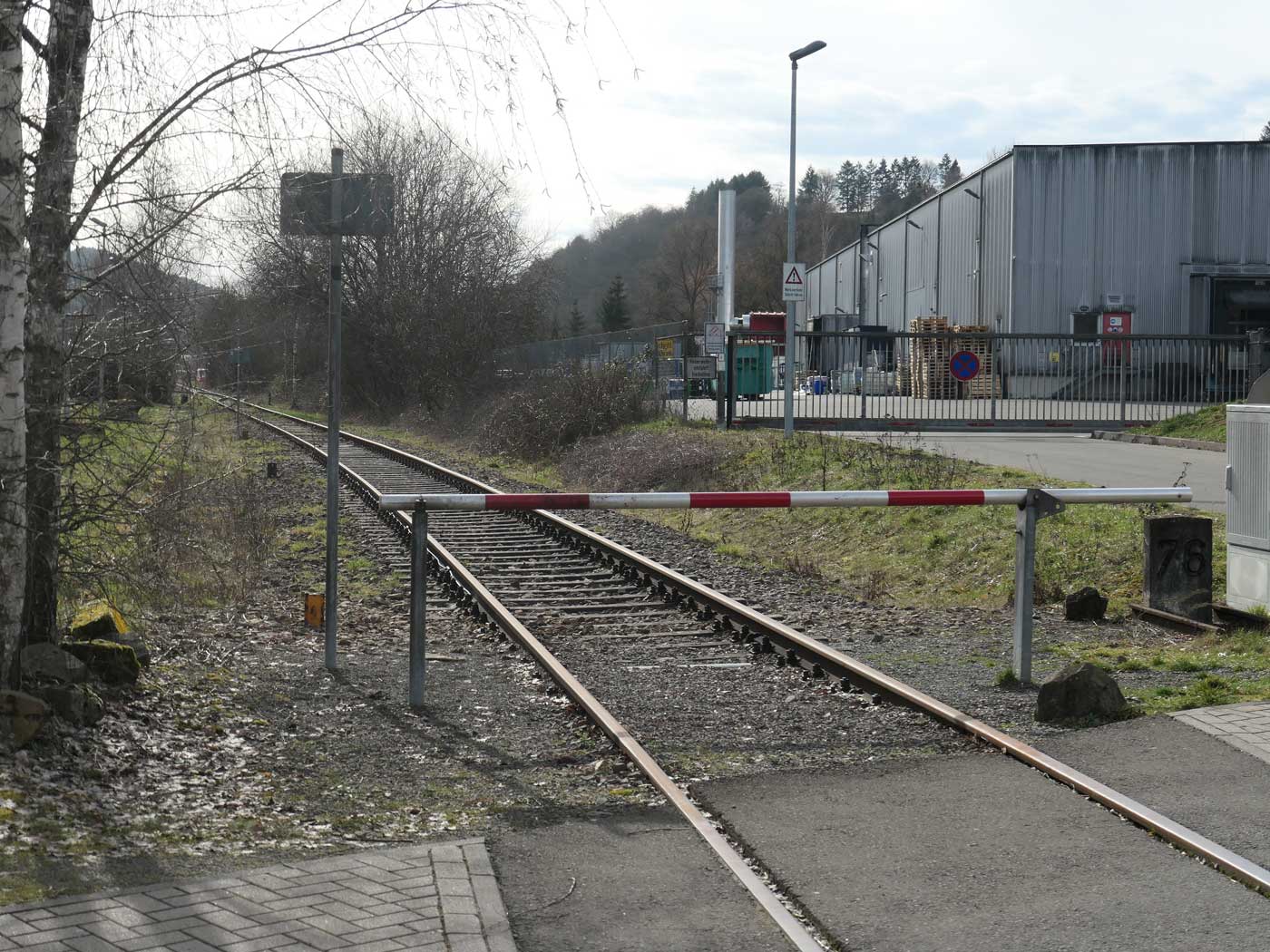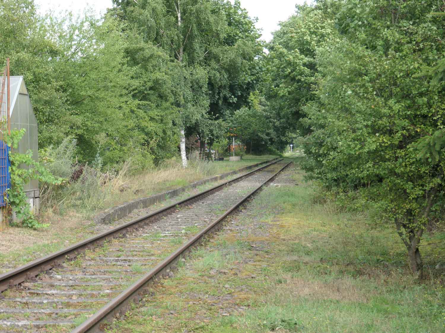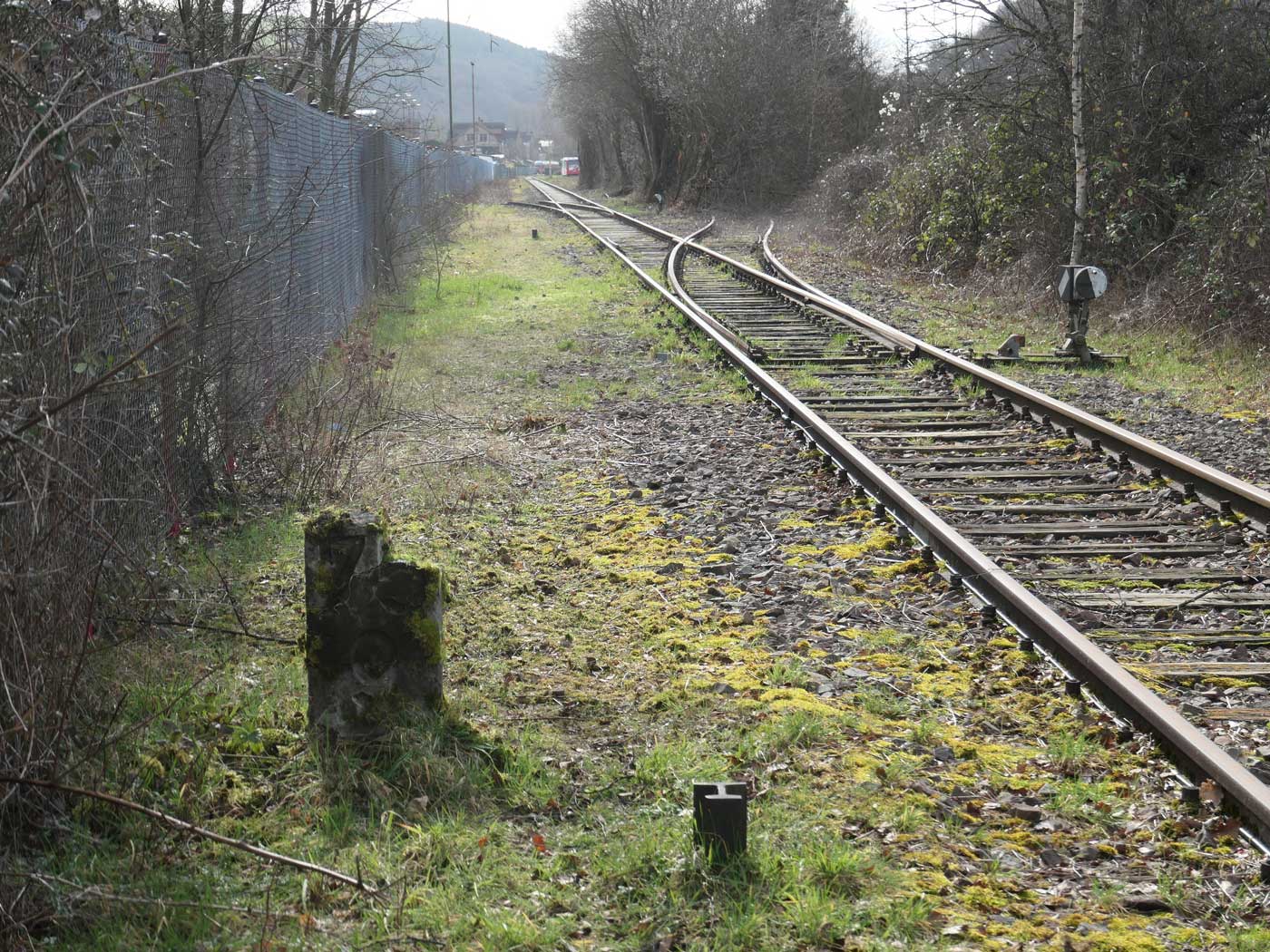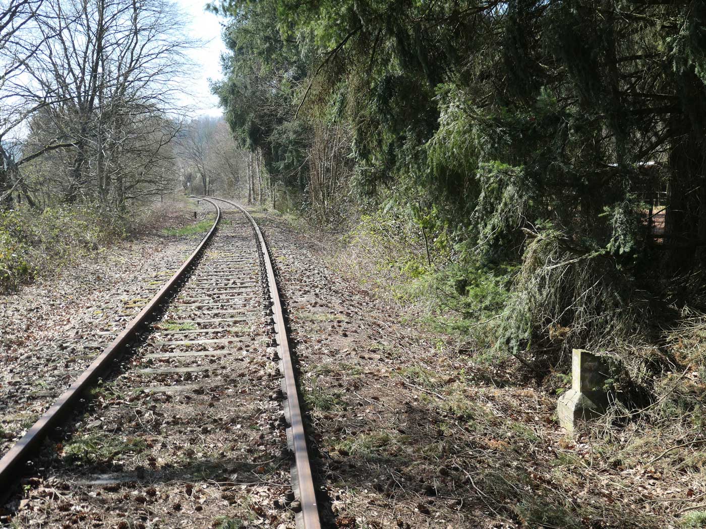 Rechts zwischen Gsp und Lampenmast am Zaun befindet sich km 34,4 der Strecke