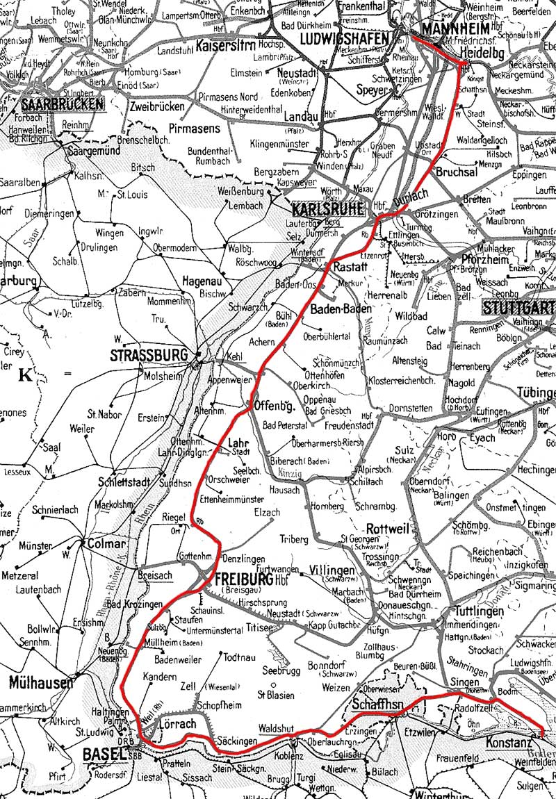 Mannheim Hbf - Heidelberg Hbf - Karlsruhe Hbf - Basel Bad. Bf - Singen (Hoh) - Konstanz - Staatsgrenze