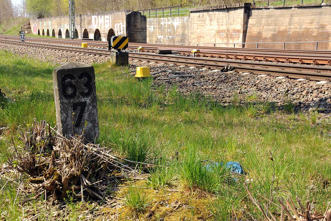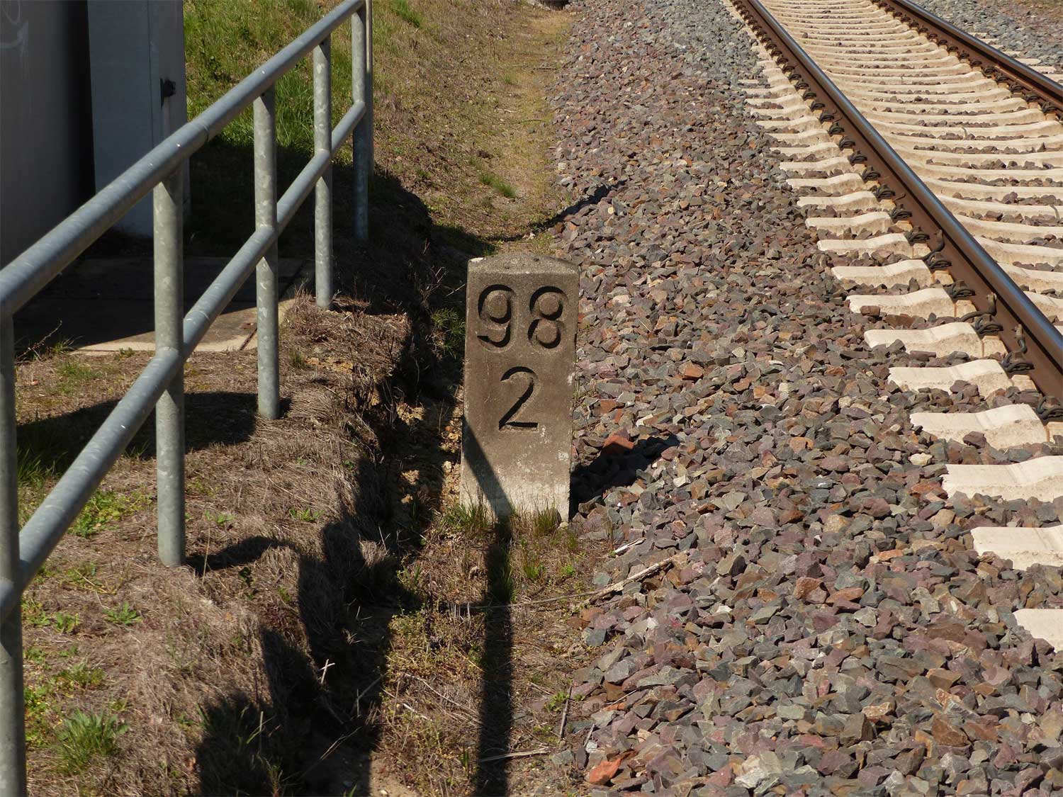 km 0,00 der Strecke Halle (Saale) Hbf 0,00 - Sangerhausen 59,22 - Nordhausen 97,07 - Eichenberg 170,48 - Hann. Münden 193,54 | ||