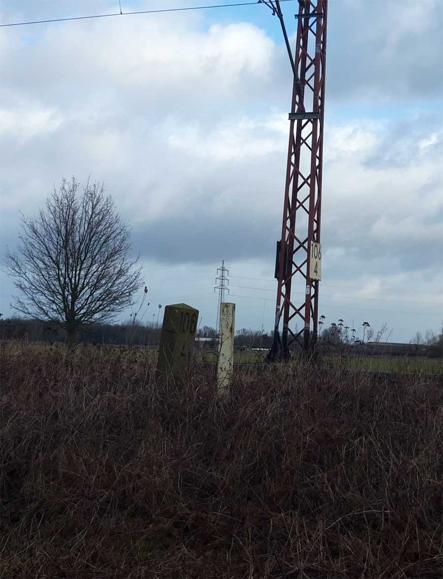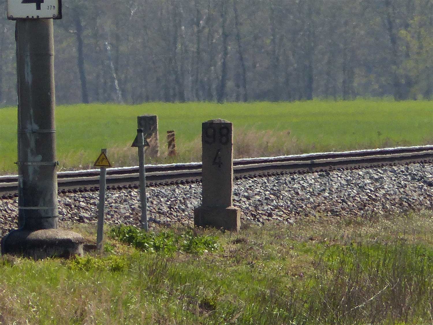 km 140,2 (Tafel) und km 140,3 (Stein ganz links) in Röderau - Blick Richtung Jüterbog - Berlin