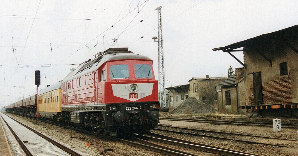 Bitterfeld | 131,64 | km 48,51 der Strecke (Biederitz 0,68) - ehem. Landesgrenze Preußen/ Anhalt km 30,32 = km 0,0 - Bk Trebnitz 0,004 - Zerbst 4,87 - Dessau Hbf 22,96 - Bitterfeld 48,51 - Leipzig Hbf 81,26 (siehe auch Tabelle 4, Ziffer 1) |