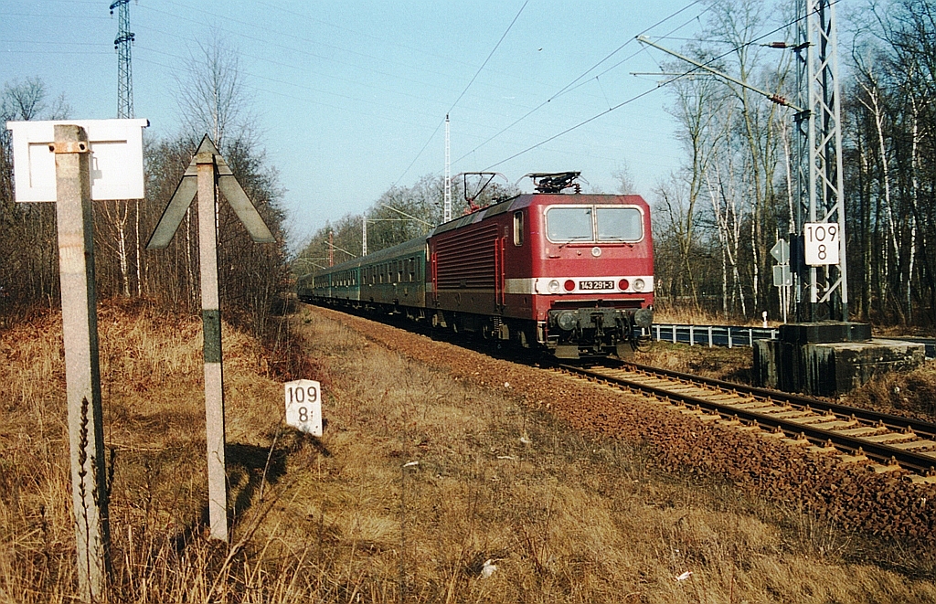 94 (Berlin Anhalter Bf -0,07) - Jüterbog 62,82 - Falkenberg (Elster) (unten) 111,94 - Röderau 140,87 - Abzw Zeithain Bogendreieck 142,06 (1967)
