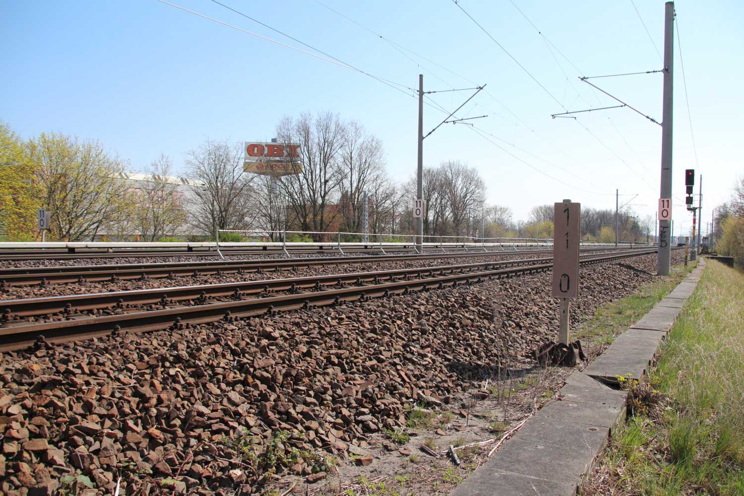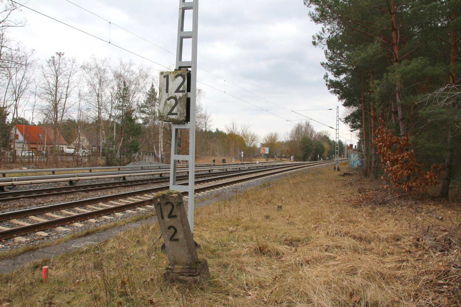 km 12,2 (Gegenrichtungsgleis, Tafel links)) am Grünauer Kreuz - Blick Richtung Berlin