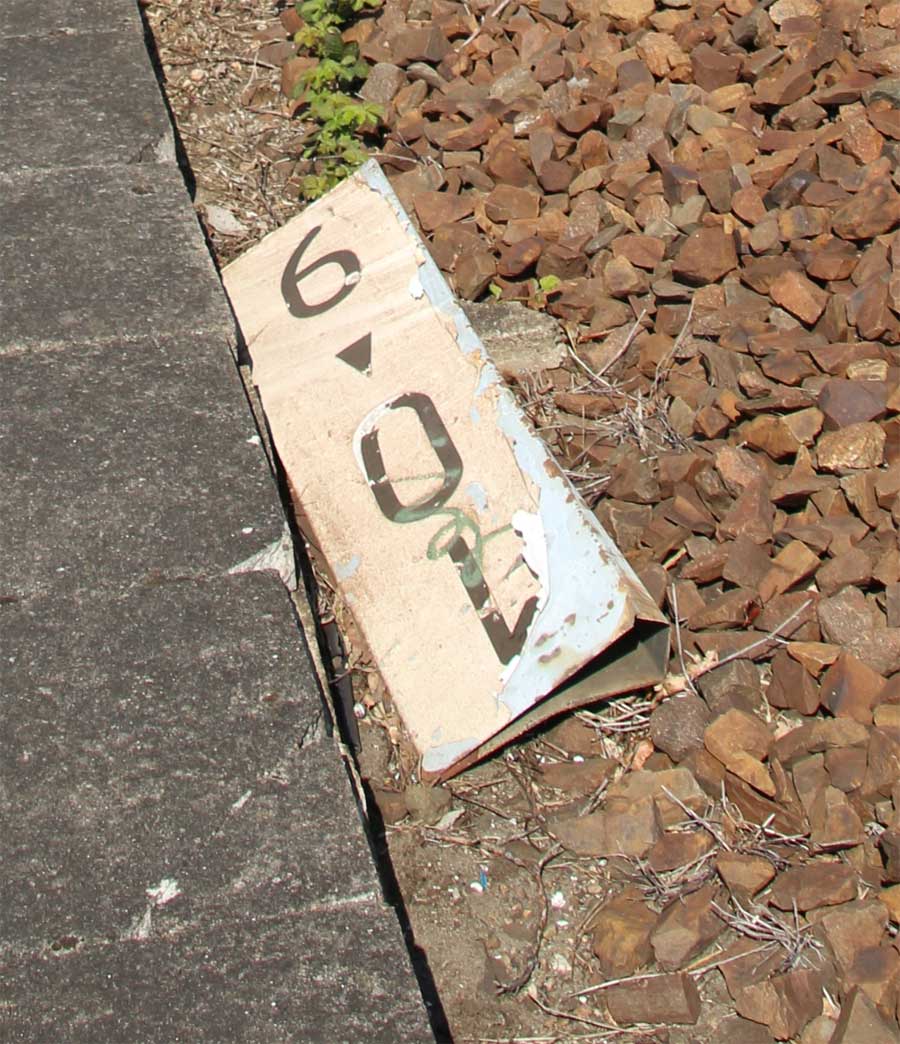 km 0,6 (Tafel) und km 0,7 (Stein) gehören zum Gegenrichtungsgleis (lange Kurve) der Strecke