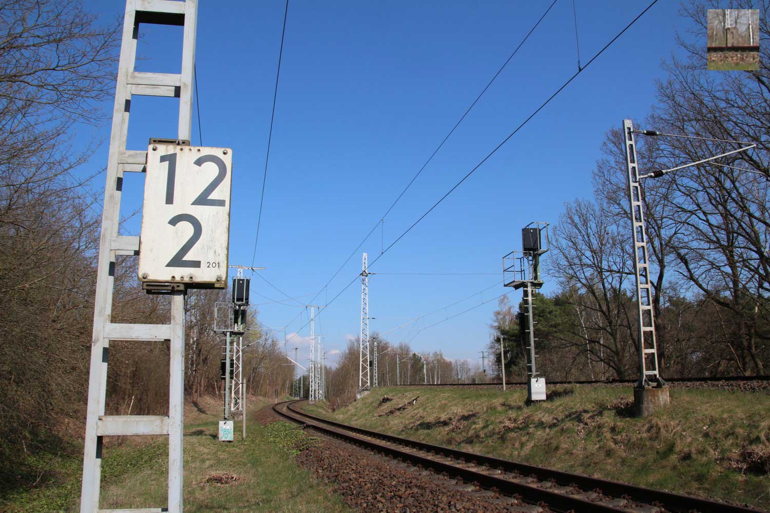 km 12,8 (Gegenrichtungsgleis, rechte Tafel) am Grünauer Kreuz - Blick Richtung Görlitz