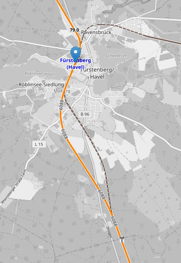Fürstenberg (Meckl) | 78,04 | km 123,19 der Strecke (Berlin Stettiner Bf -0,28) - Britz 52,02 - Templin 92,68 - Fürstenberg (Meckl) 123,19 |