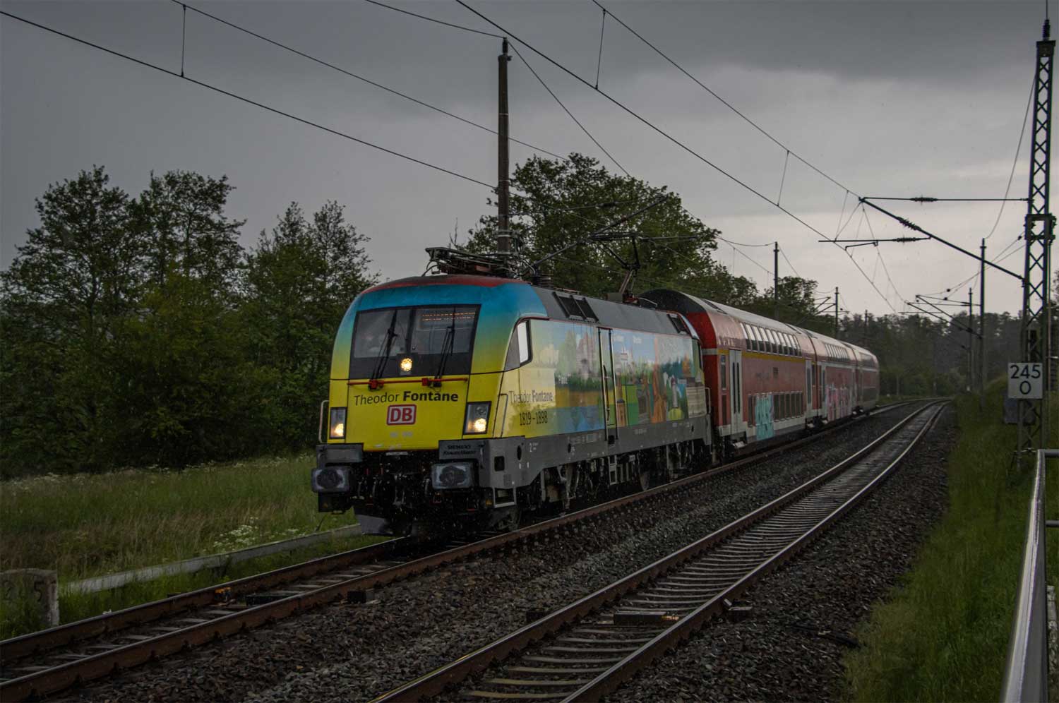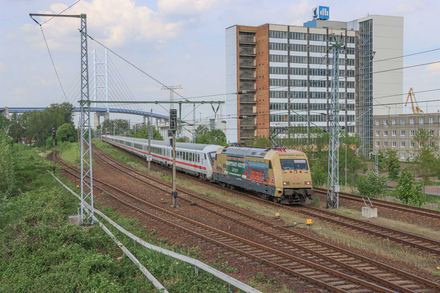 Neustrelitz Reichsb | 98,53 | km 0,0 der Strecke Neustrelitz 0,0 - Waren (Müritz) 34,05 - Lalendorf 69,73 - Plaaz 80,86 - Rostock Hbf 113,20 - Warnemünde Hbf 126,30 (auch 126,48) |