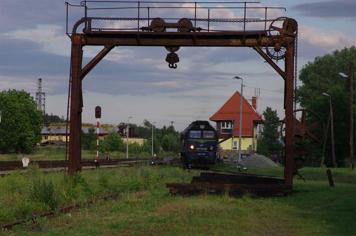 Umsetzten in Scinawka Srednia (Mittelsteine): ST44-1223 rangiert einen Schotterzug aus dem Kleinbahnhof Ścinawka Średnia Dworzec Mały (Mittelsteine Kleinbahnhof) zum Bahnhof.