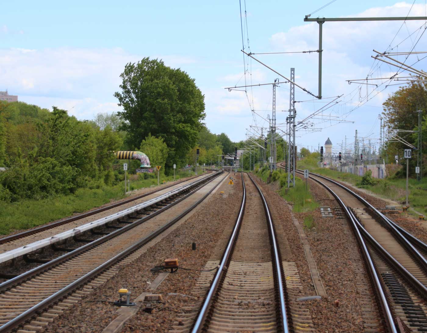 Rechts erhöht die Strecke Berlin Frankfurter Allee, W67, km -0,013 - Berlin-Rummelsburg Rbf, W181, km 4,189 (6140)