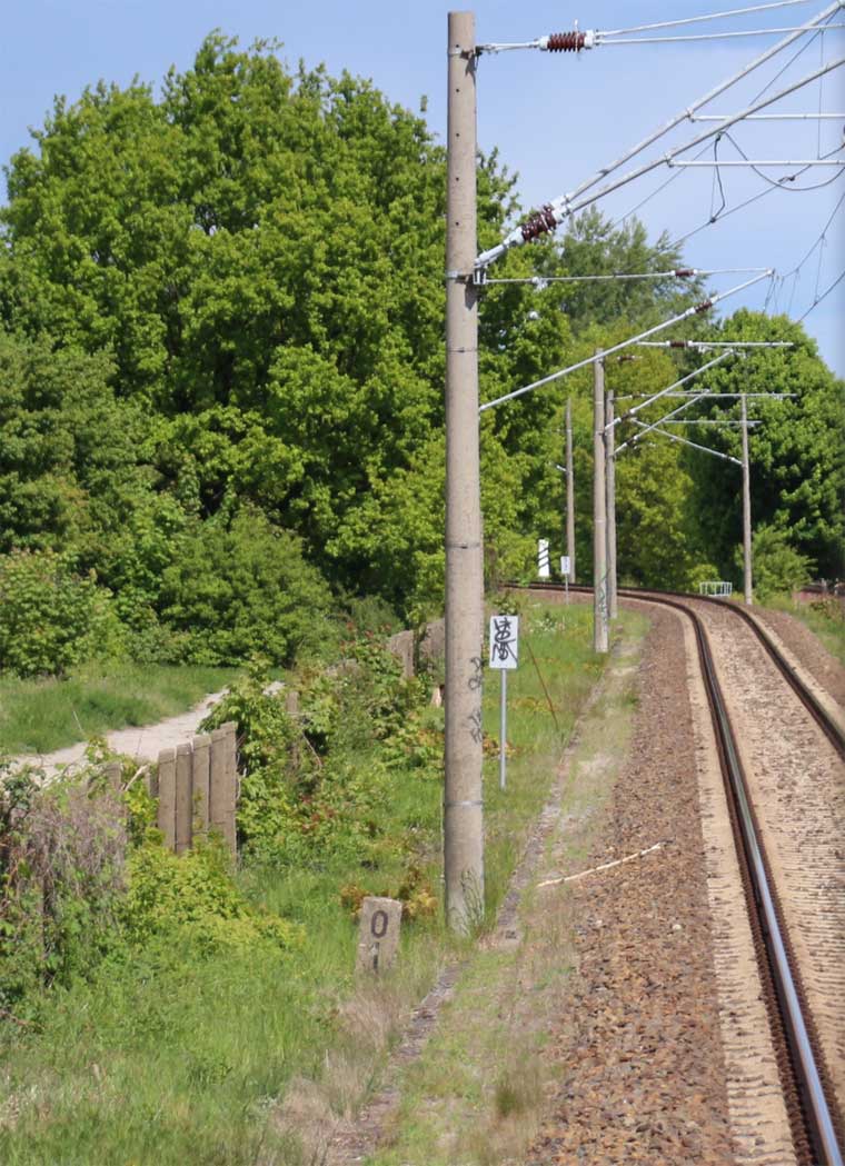 km 0,1 (Stein) im Vordergrund gehörte zur Verbindungskurve Abzw Treskowallee (Atr) - Wuhlheide B1