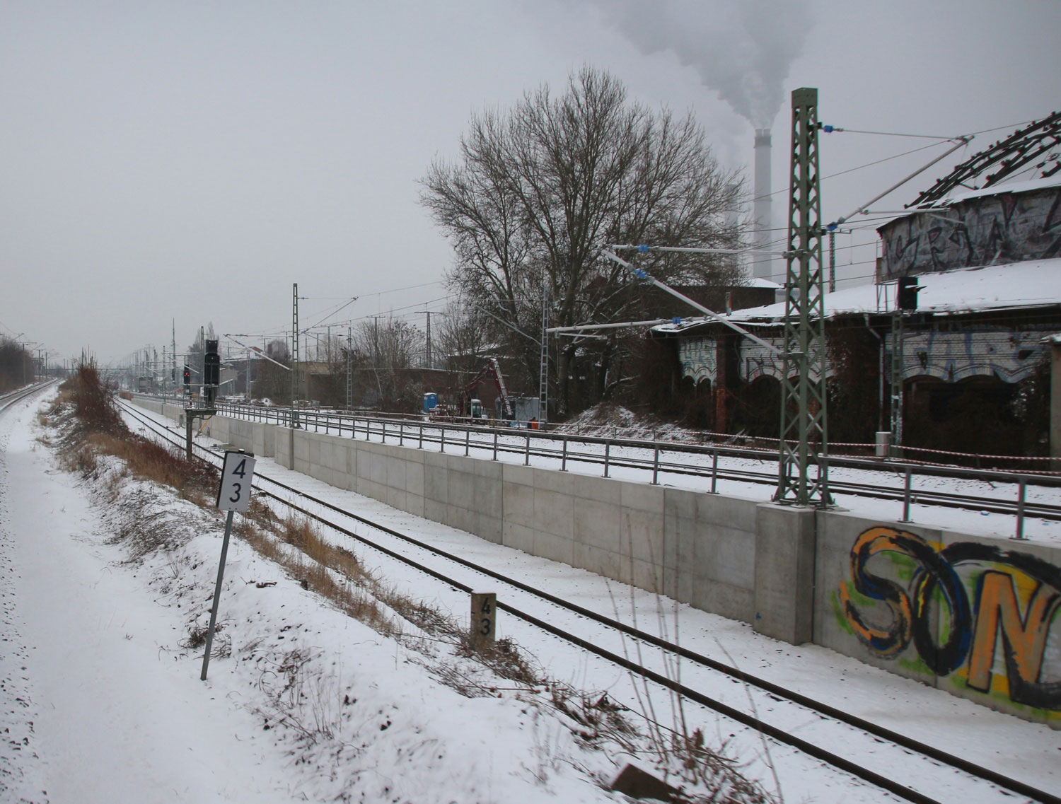 Unmittelbar hinter dem Zaun im Vordergrund die S-Bahnstrecke Berlin Ostbahnhof (S-Bahn) 0,0 - Erkner (S-Bahn) 24,38 (6004)