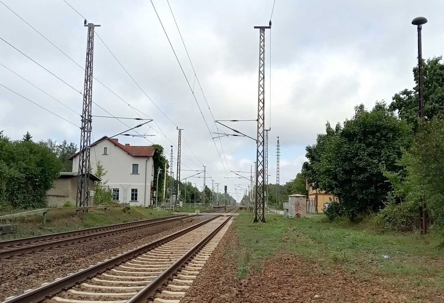 Scheune 129,61 km 4,80 der Strecke Stettin Hbf 0,0 - Pasewalk 41,93 - Strasburg (Uckermark) 60,20 - Landesgrenze Preußen/Mecklenburg (km-Wechsel km 62,00 = km 232,26, auch Angabe km km 61,14 = km 234,14) - (Neubrandenburg 200,92 - Lübeck Hbf 0,0)