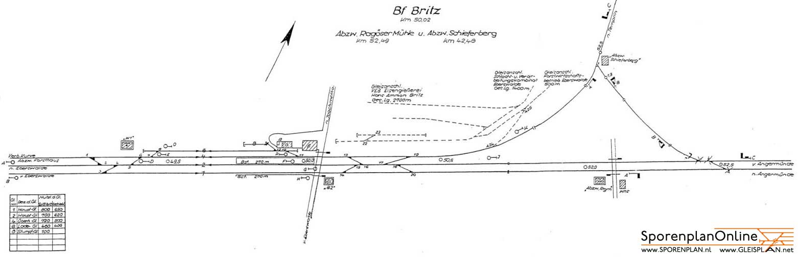 ► | km 50,02 der abgehenden Strecke (Berlin Stettiner Bf -0,28) - Britz 50,02 - Templin 92,68 - Fürstenberg (Havel) 123,19 mit weiterlaufender Kilometrierung (Streckenverzweigung mit gemeinsamen Nullpunkt Berlin Stettiner Bf) | |