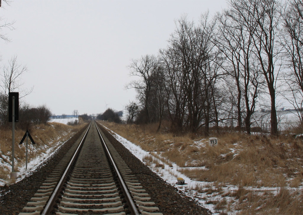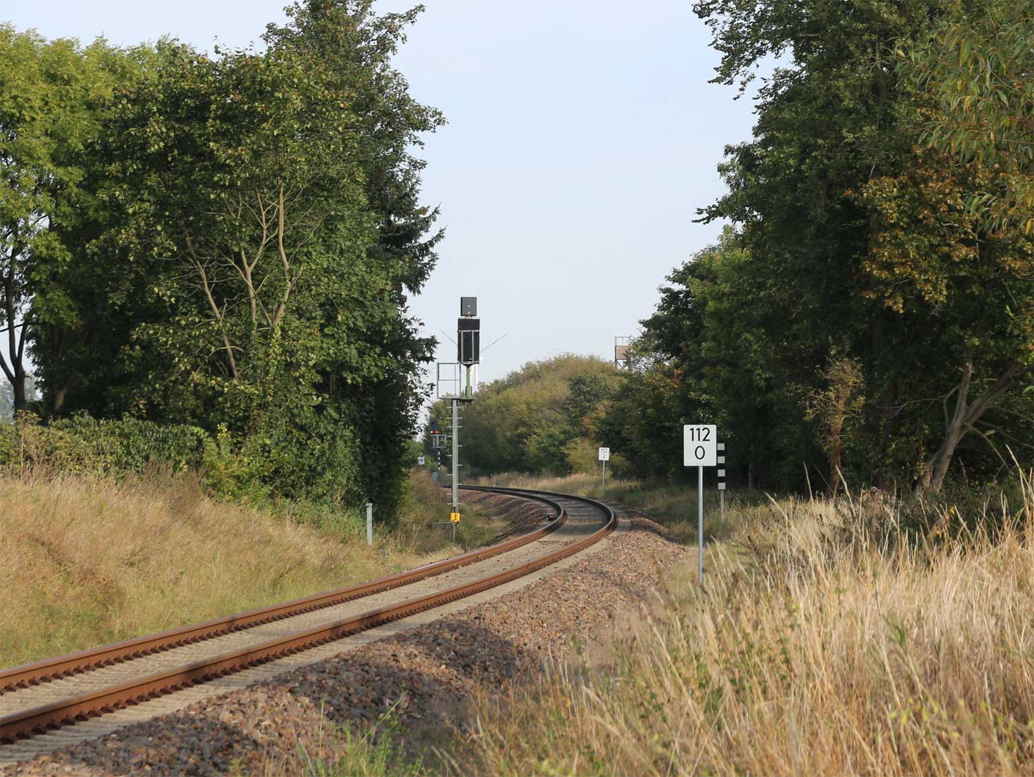 km -1,82 der Verbindungsstrecke zur Nordbahn [Berlin Nordbahnhof (alt) 0,0 - Neustrelitz 98,53 - Neubrandenburg 133,73 - Stralsund 222,64 (kommend)/223,60 (gehend) - Saßnitz 272,72 - Saßnitz Hafen 274,46] | ||