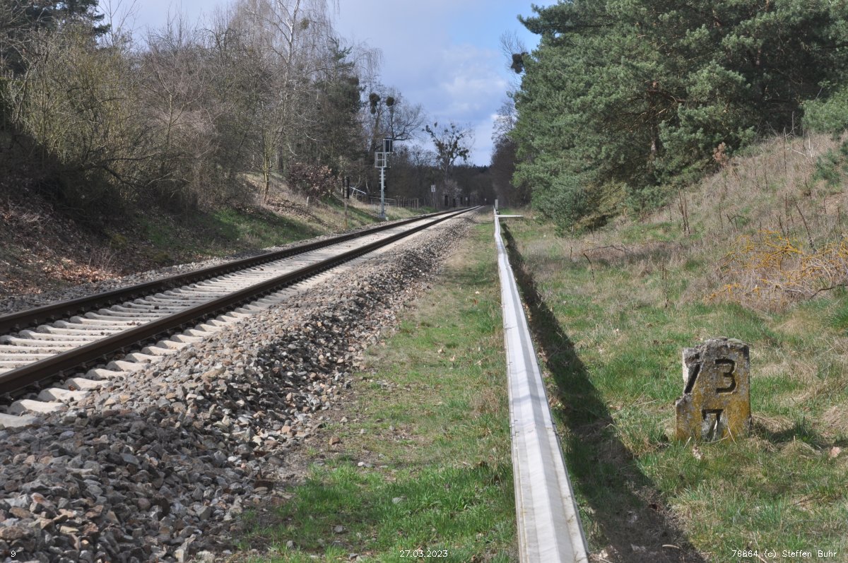 ► | km 101,17 der abgehenden Strecke (Berlin Stettiner Bf -0,28) - Werbig Abzw. 101,17 - Werbig Gbf 102,66 mit weiterlaufender Kilometrierung (Streckenverzweigung mit gemeinsamen Nullpunkt Berlin Stettiner Bf) | |