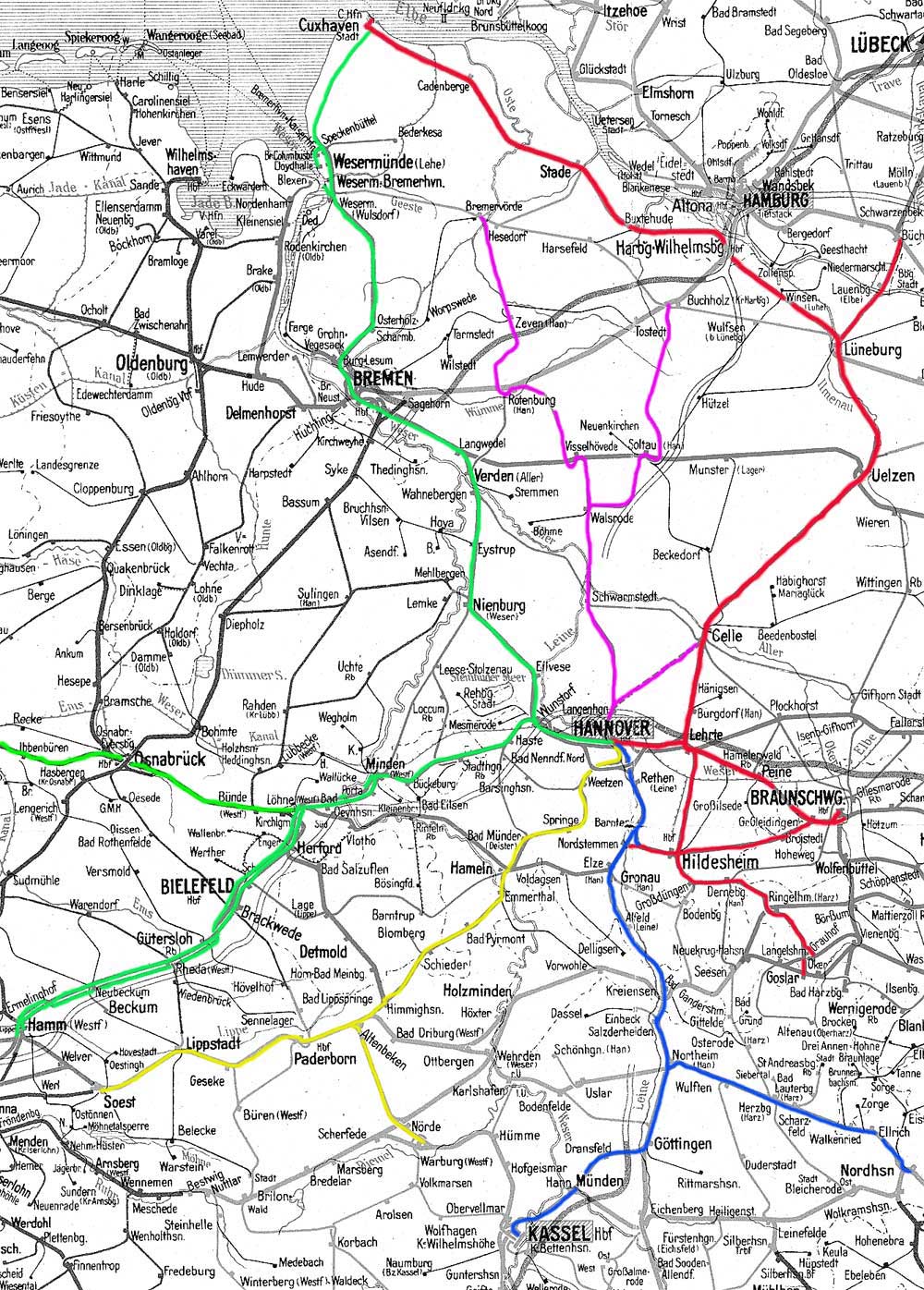 - Cuxhaven Stadt - (Hannover Hbf) - Wunstorf - Minden (Westf) - Löhne (Westf) - Bielefeld Hbf - Hamm (Westf) Pbf - (Hannover Hbf - Wunstorf) - Minden (Westf) - Löhne (Westf) - Bielefeld Hbf - Hamm (Westf) Gbf - [Hannover Hbf - Wunstorf - Minden (Westf)] - Löhne (Westf) - Osnabrück Hbf Pu (unten) - Rheine (Westf) - (Hannover Hbf) - Wesermünde-Wulsdorf (heute: Bremerhaven-Wulsdorf) - Wesermünde (Geestemünde) (heute: Bremerhaven-Geestemünde) - (Hannover Hbf) - Speckenbüttel (heute: Bremerhaven-SpeckenbütteI) - Bremerhaven Kaiserhafen - Bremerhaven Seehafen Freihafen - (Hannover Hbf) - Bremerhaven