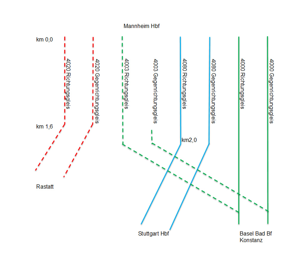 8.10.2 Streckenverzweigung mit gemeinsamen Nullpunkt Mannheim Hbf (Richtung Karlsruhe und Rastatt)