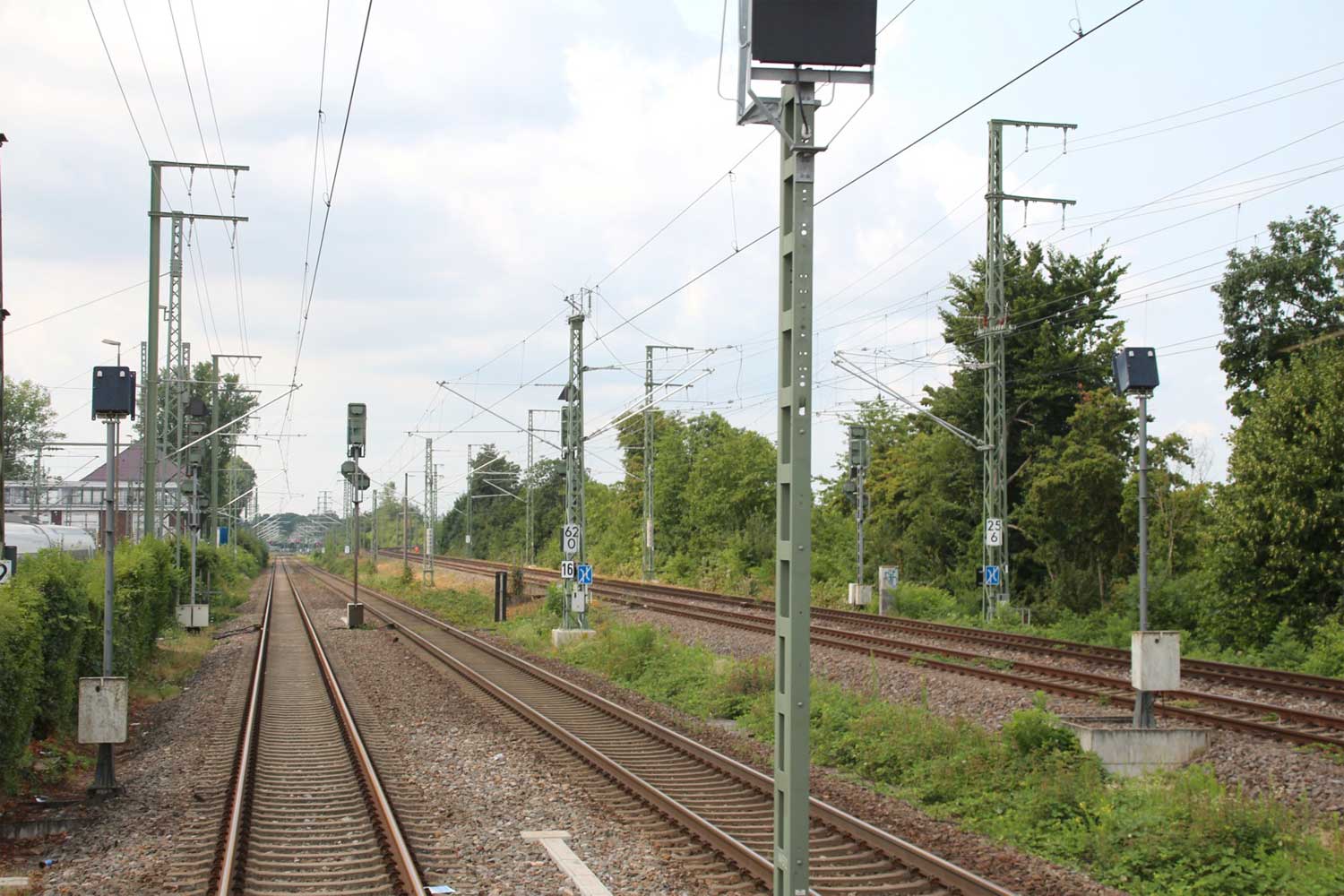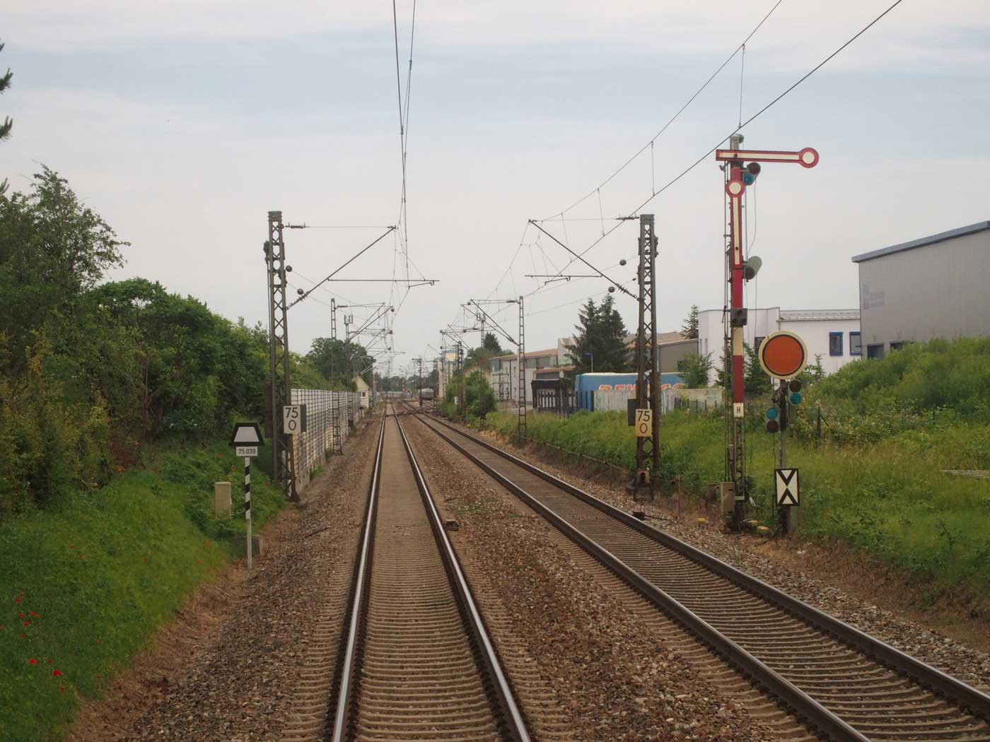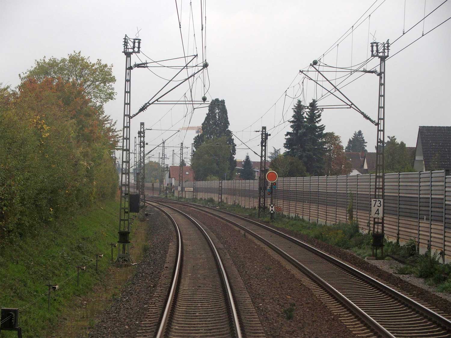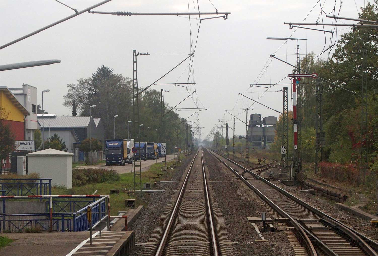 Links am Bahnsteigende km 96,6 der Strecke Mannheim Hbf 0,0 - Heidelberg Hbf (alt) 18,2 (neu) 17,4 = 19,1 - Karlsruhe Hbf 72,90 - Basel Bad. Bf 270,69 - Singen (Hoh) 384,08 - Konstanz 414,34 - Staatsgrenze 414,83