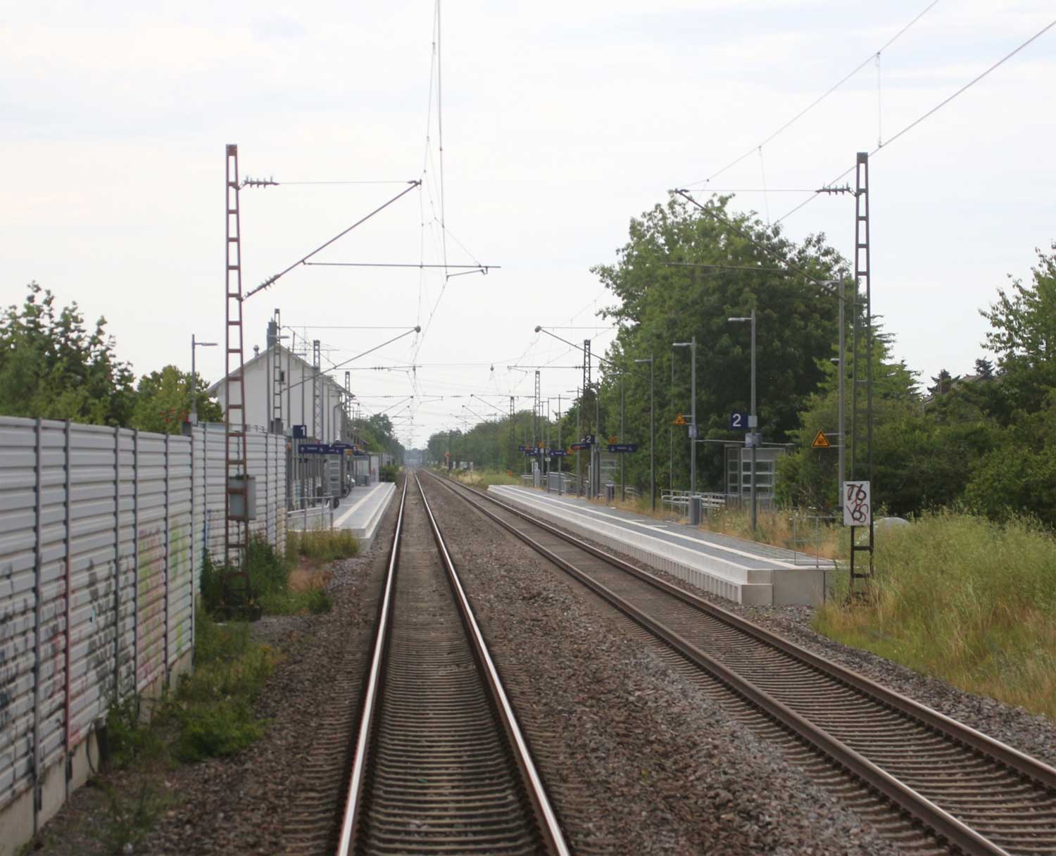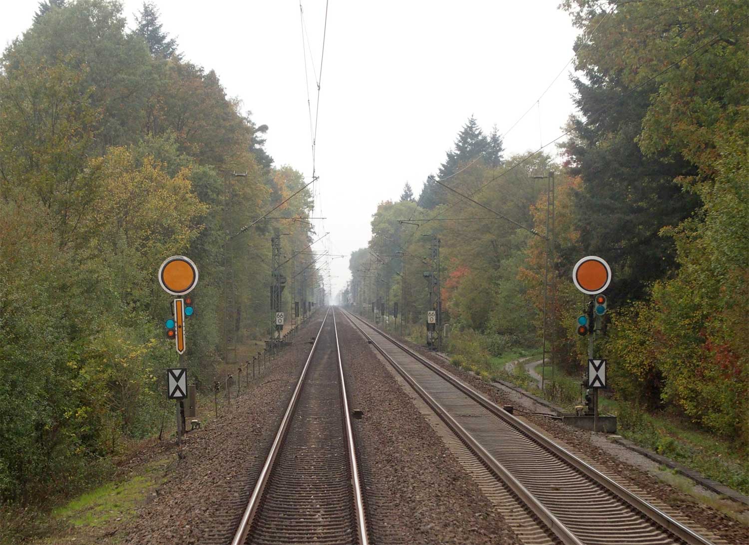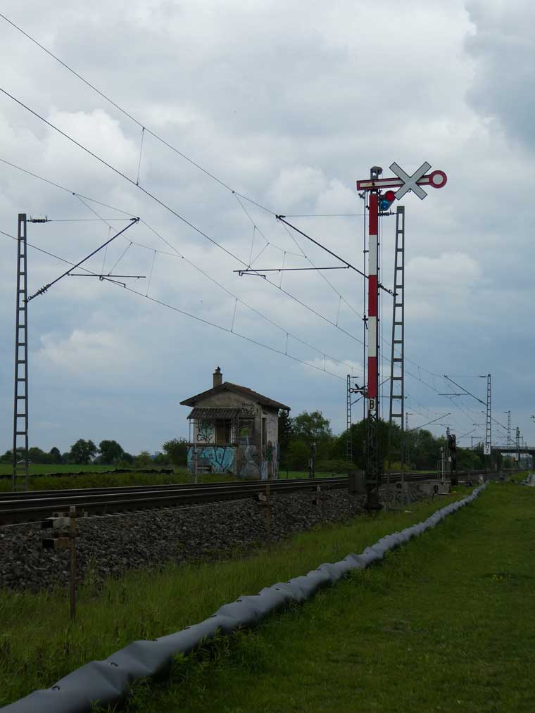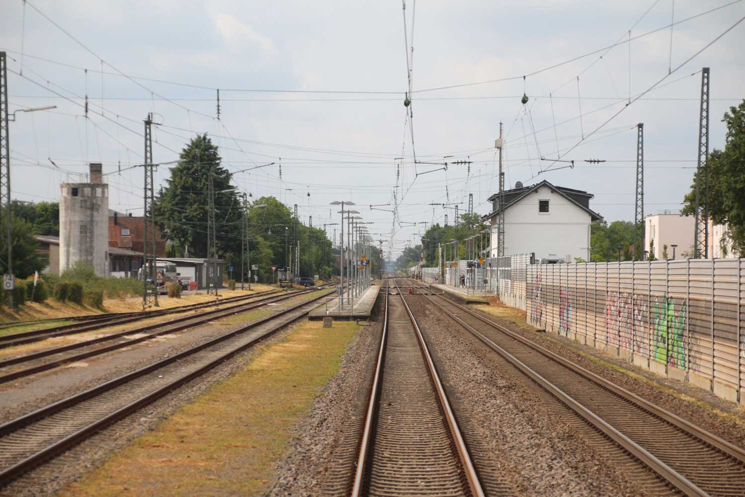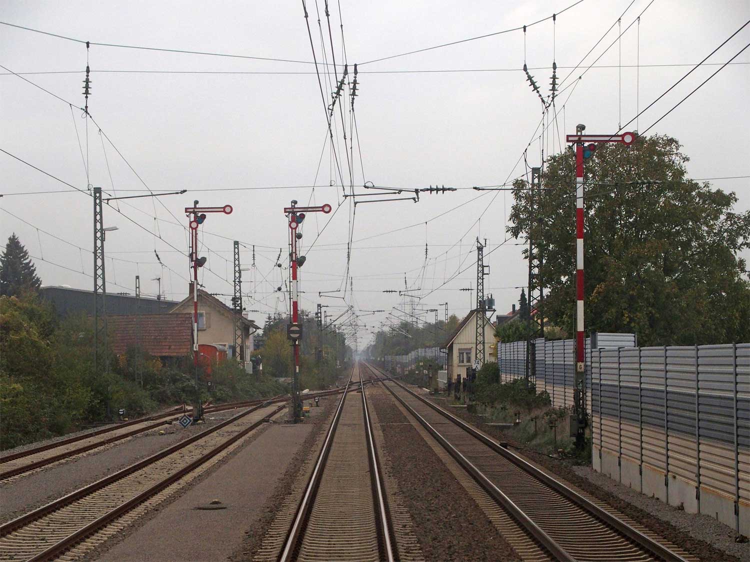 Links am Bahnsteigende km 96,6 der Strecke Mannheim Hbf 0,0 - Heidelberg Hbf (alt) 18,2 (neu) 17,4 = 19,1 - Karlsruhe Hbf 72,90 - Basel Bad. Bf 270,69 - Singen (Hoh) 384,08 - Konstanz 414,34 - Staatsgrenze 414,83