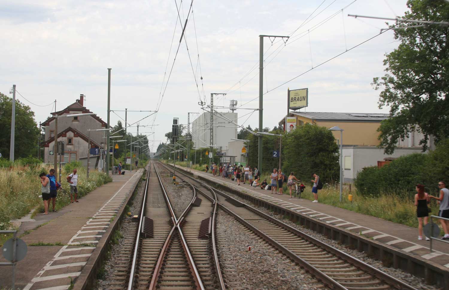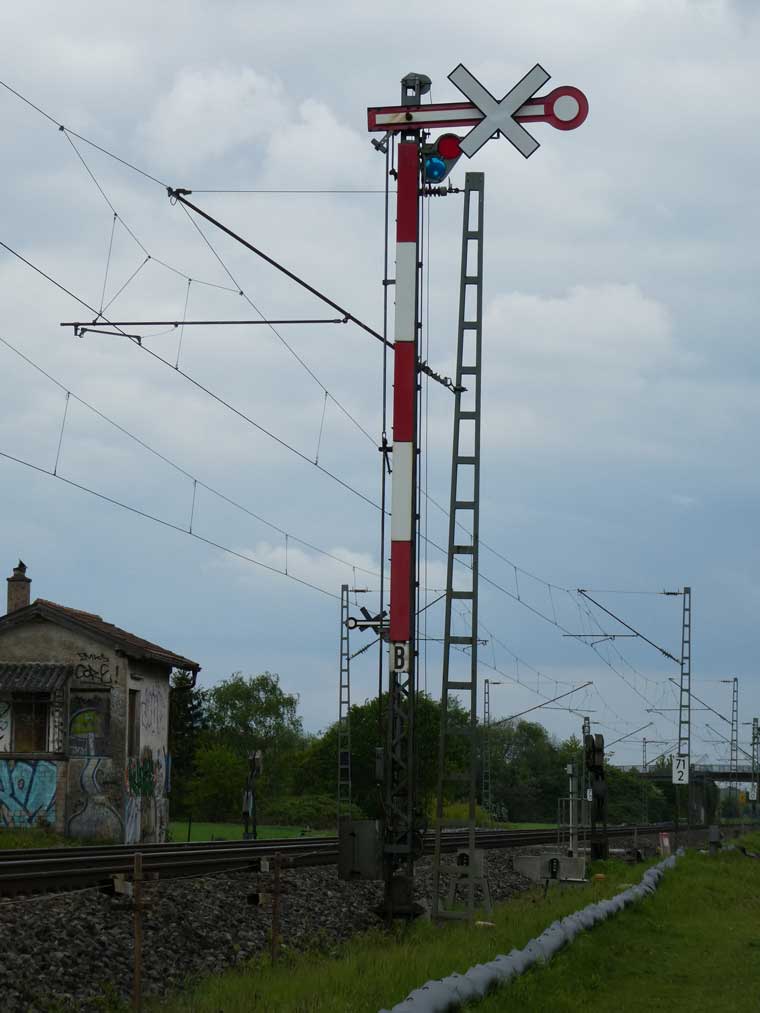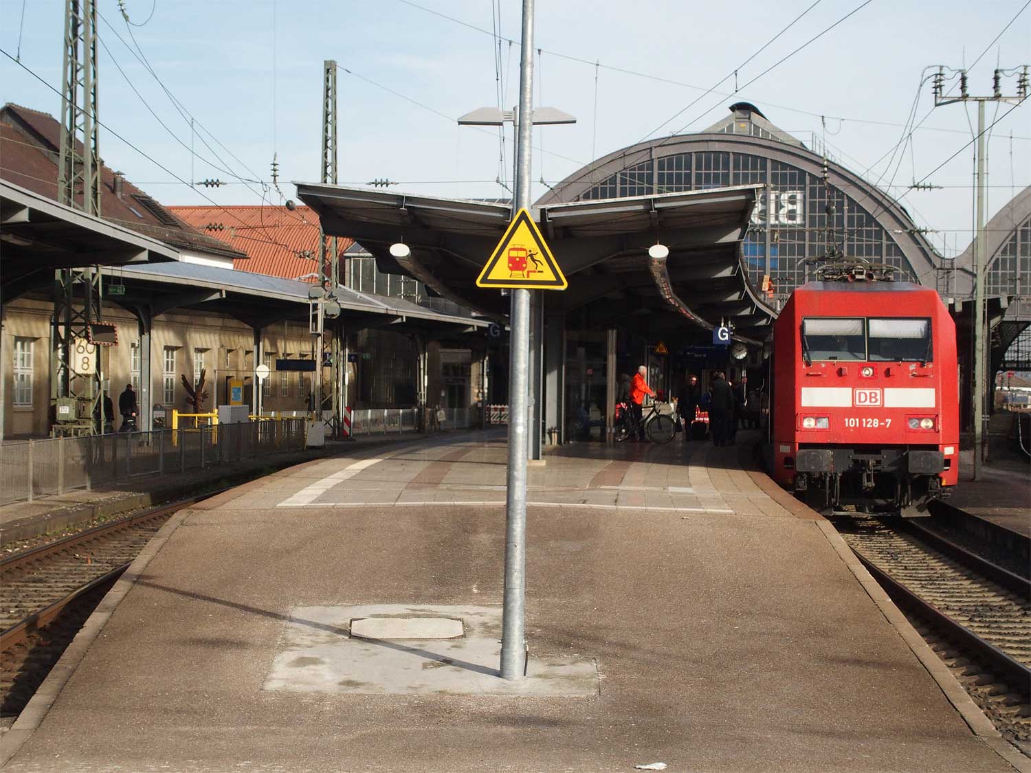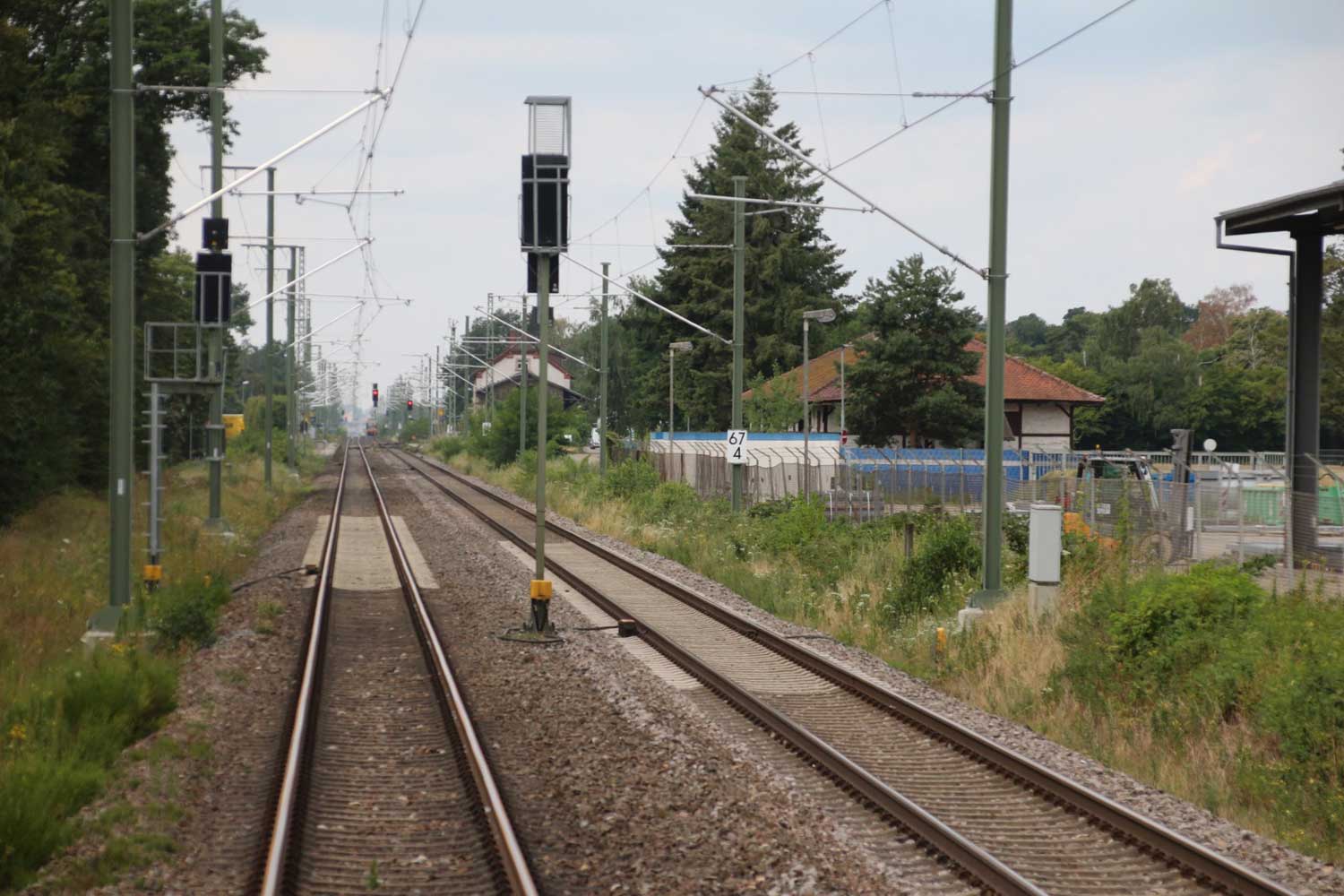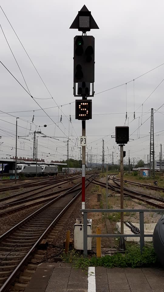 Links am Bahnsteigende km 96,6 der Strecke Mannheim Hbf 0,0 - Heidelberg Hbf (alt) 18,2 (neu) 17,4 = 19,1 - Karlsruhe Hbf 72,90 - Basel Bad. Bf 270,69 - Singen (Hoh) 384,08 - Konstanz 414,34 - Staatsgrenze 414,83