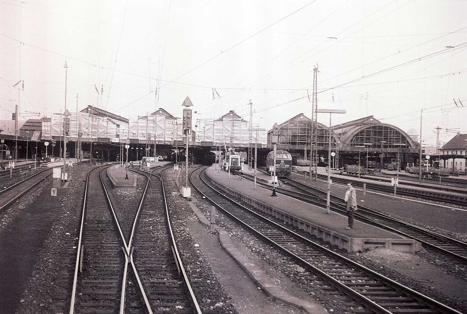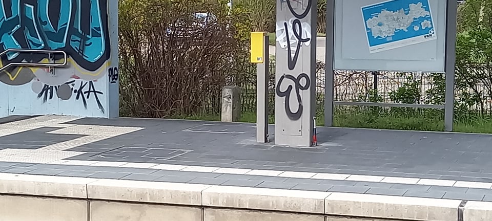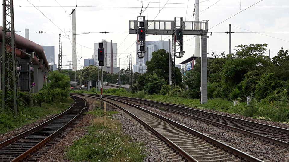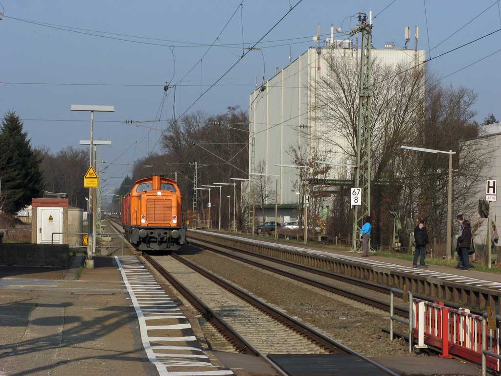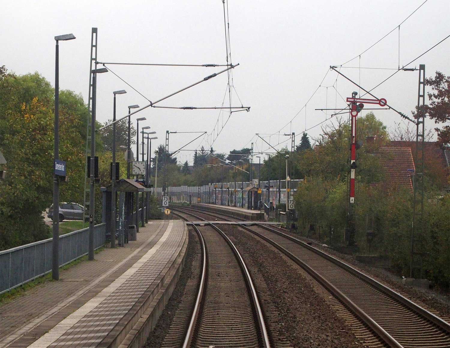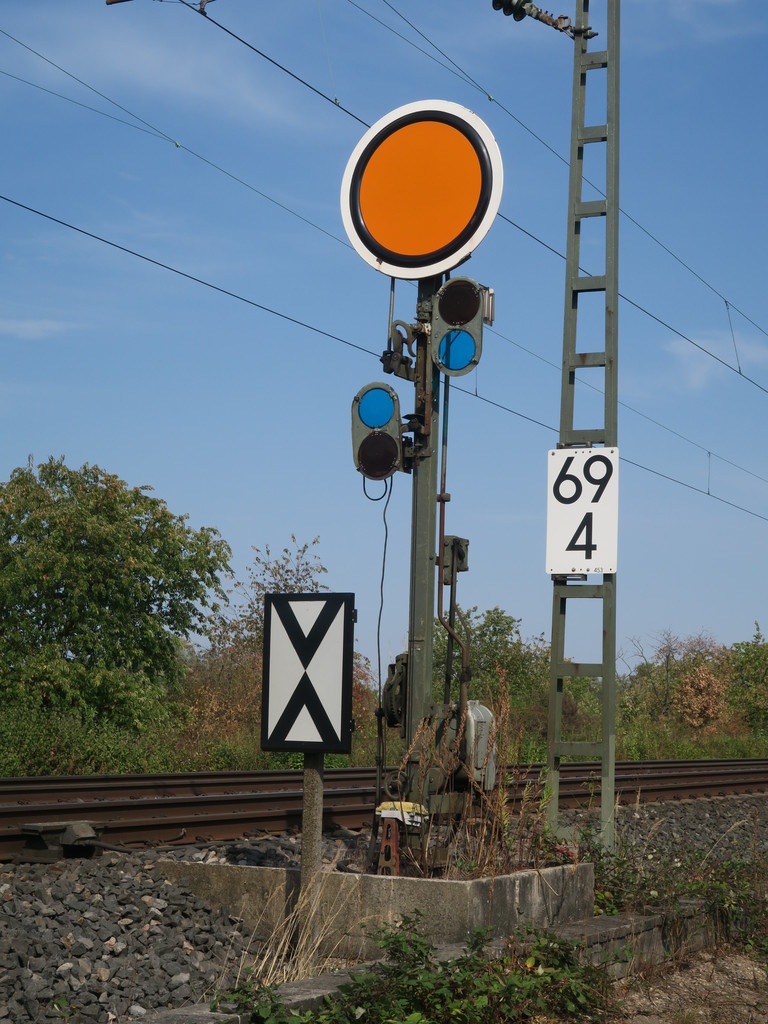 Links am Bahnsteigende km 96,6 der Strecke Mannheim Hbf 0,0 - Heidelberg Hbf (alt) 18,2 (neu) 17,4 = 19,1 - Karlsruhe Hbf 72,90 - Basel Bad. Bf 270,69 - Singen (Hoh) 384,08 - Konstanz 414,34 - Staatsgrenze 414,83