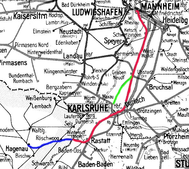 Mannheim Hbf 0,0 - Schwetzingen 13,56 - Graben-Neudorf 39,74 - Karlsruhe Hbf 60,66 - Durmersheim 74,14 - Rastatt 82,93 - Wintersdorf (Baden) 90,15 - Staatsgrenze 92,014 = [km 28,540 (Rheinbrücke)- Roeschwoog 21,819 - Hagenau (Els) 0,0]