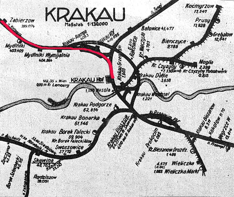 Wien Nord (Wien Praterstern) 0,1 - Staatsgrenze Österreich/Tschechien 77,992 - Lundenburg (Břeclav) 83,131 - Prerau (Přerov) 183,453 - Mährisch Weißkirchen (Hranice na Moravě) 211,86 - Grenze Protektorat Böhmen und Mähren/Deutschland 214,250 - Zauchtel (Oder) (Suchdol nad Odrou) 232,661 - Stauding (Studénka) 244,70 - Oderberg (Bohumín) 275,91 - Dzieditz (Czechowice-Dziedzice) 326,66 - Auschwitz (Oświęcim) 348,05 - Trzebinia 373,29 - Krakau Hbf (Kraków Głowny) 412,35