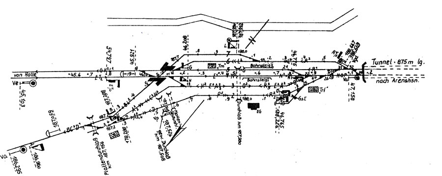 Blankenheim Trennungsbf | 188,06 | km 46,59 der Strecke Halle (Saale) Hbf 0,01 - Sangerhausen 59,22 - Nordhausen 97,07 - Eichenberg 170,48 - Hann. Münden 193,54 |