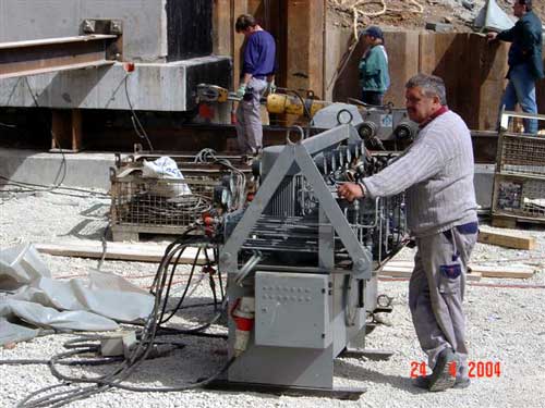 Verlegen der Gleise auf der neuen Brücke (Foto: Dirk Ammon 2004) |