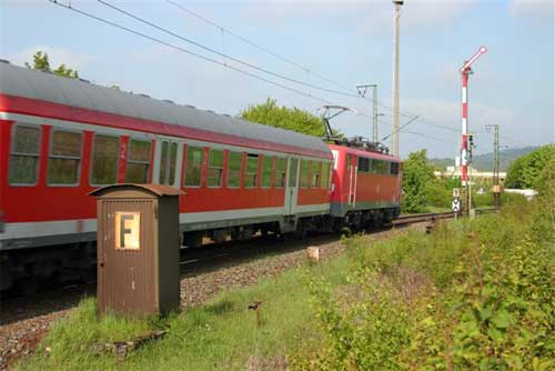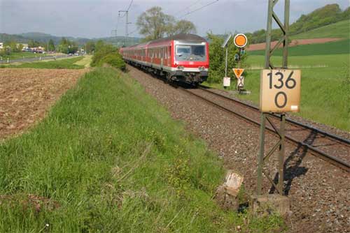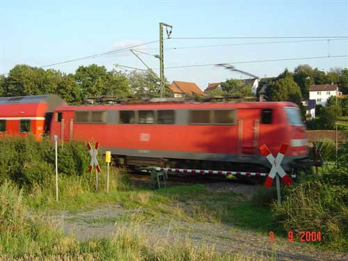 BÜ km 139,2 Das besondere am Bild ist, dass die Lok in Fahrtrichtung vor dem Steuerwagen läuft (Steuerwagen evtl. defekt). Kenner beachten den Stromabnehmer (Foto: Dirk Ammon, September 2004) |