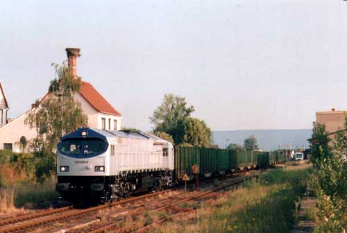 Das Foto zeigt einen Leerwagenzug mit BlueTiger am 26.06.04 bei der Durchfahrt durch Immelborn in Richtung Themar.