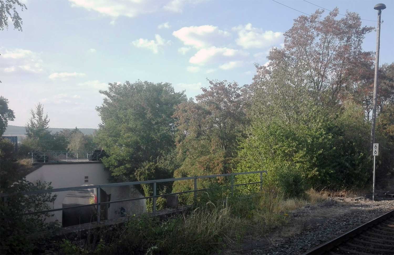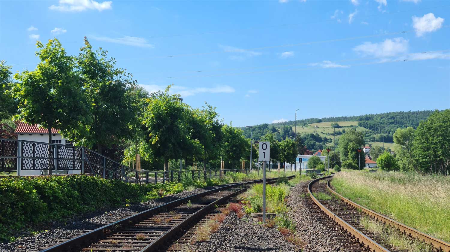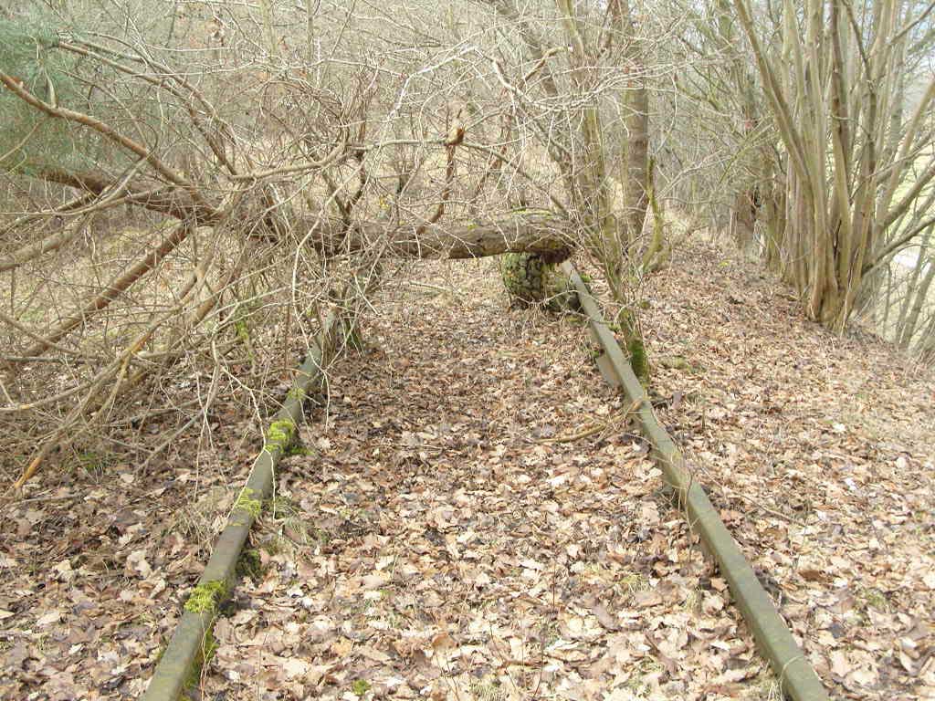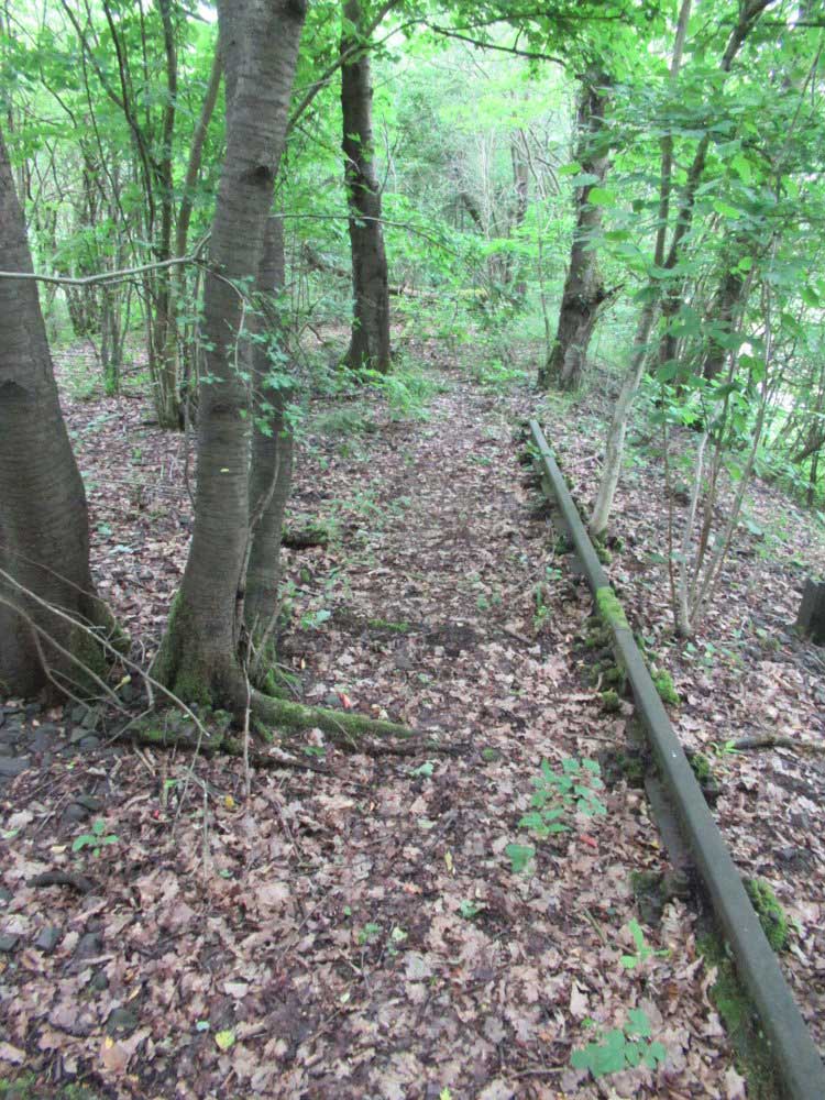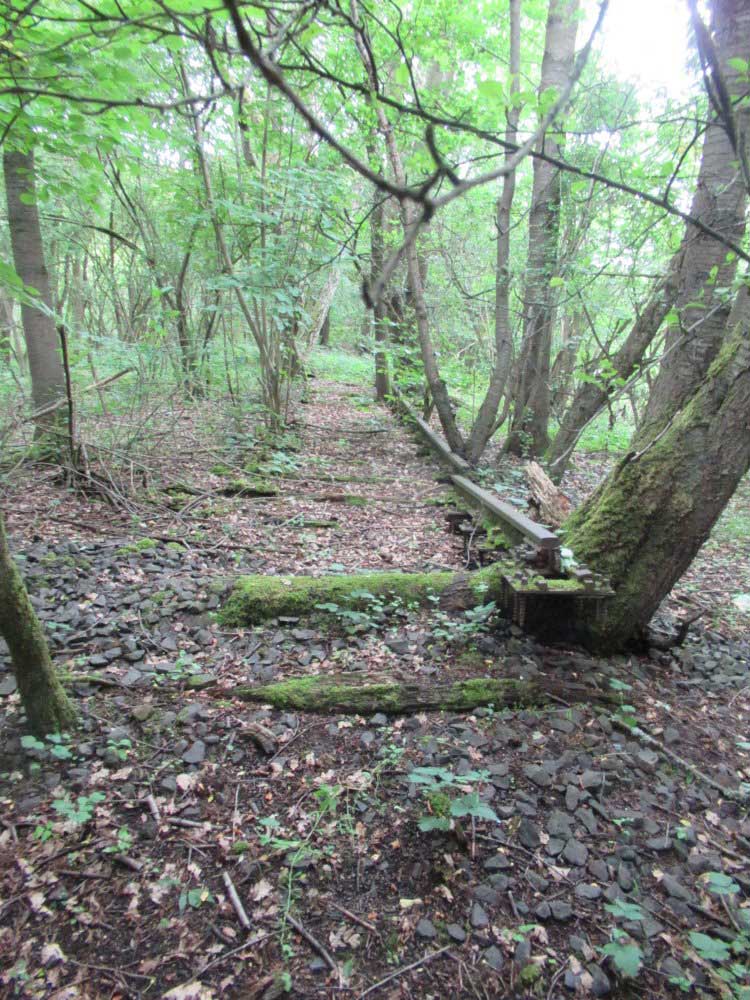 Der Weg ist das ehem. Gleis ins Ulstertal, links davon unter dem Busch das Gleis