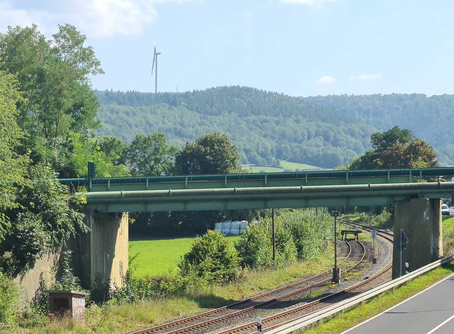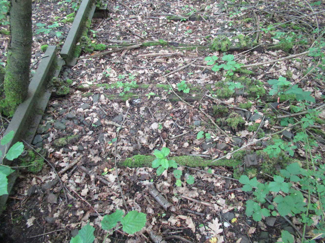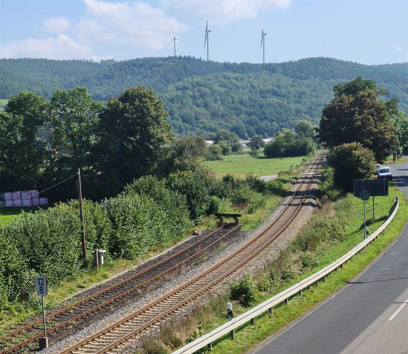 Der Weg ist das ehem. Gleis ins Ulstertal, links davon unter dem Busch das Gleis