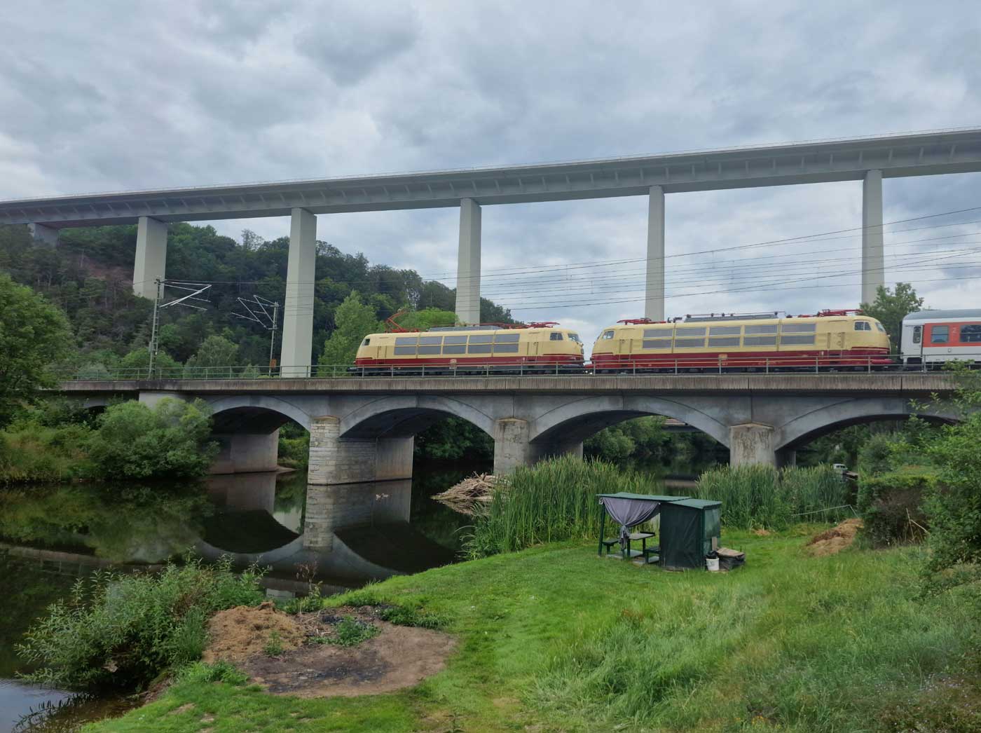 Im Hintergrund die Autobahnbrücke der A4 über die Werra.