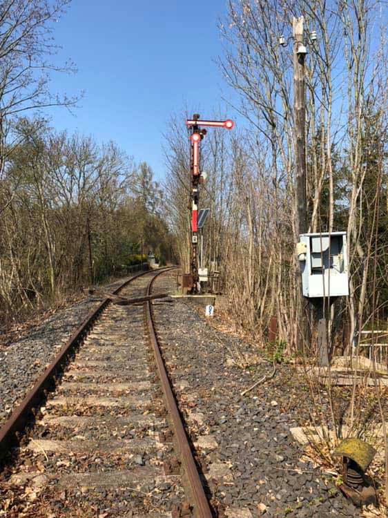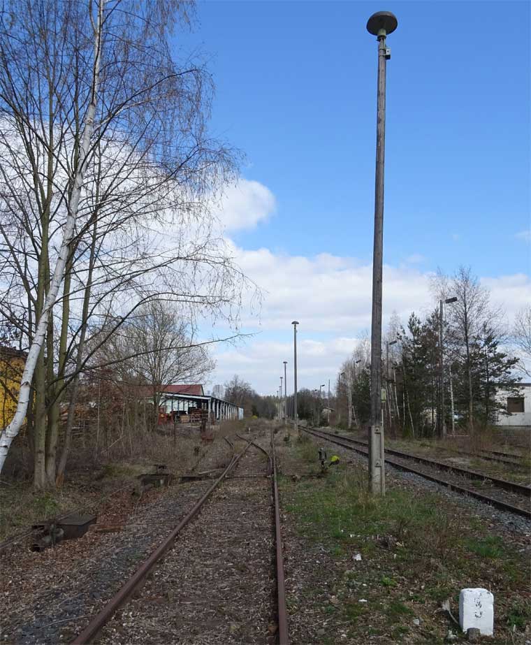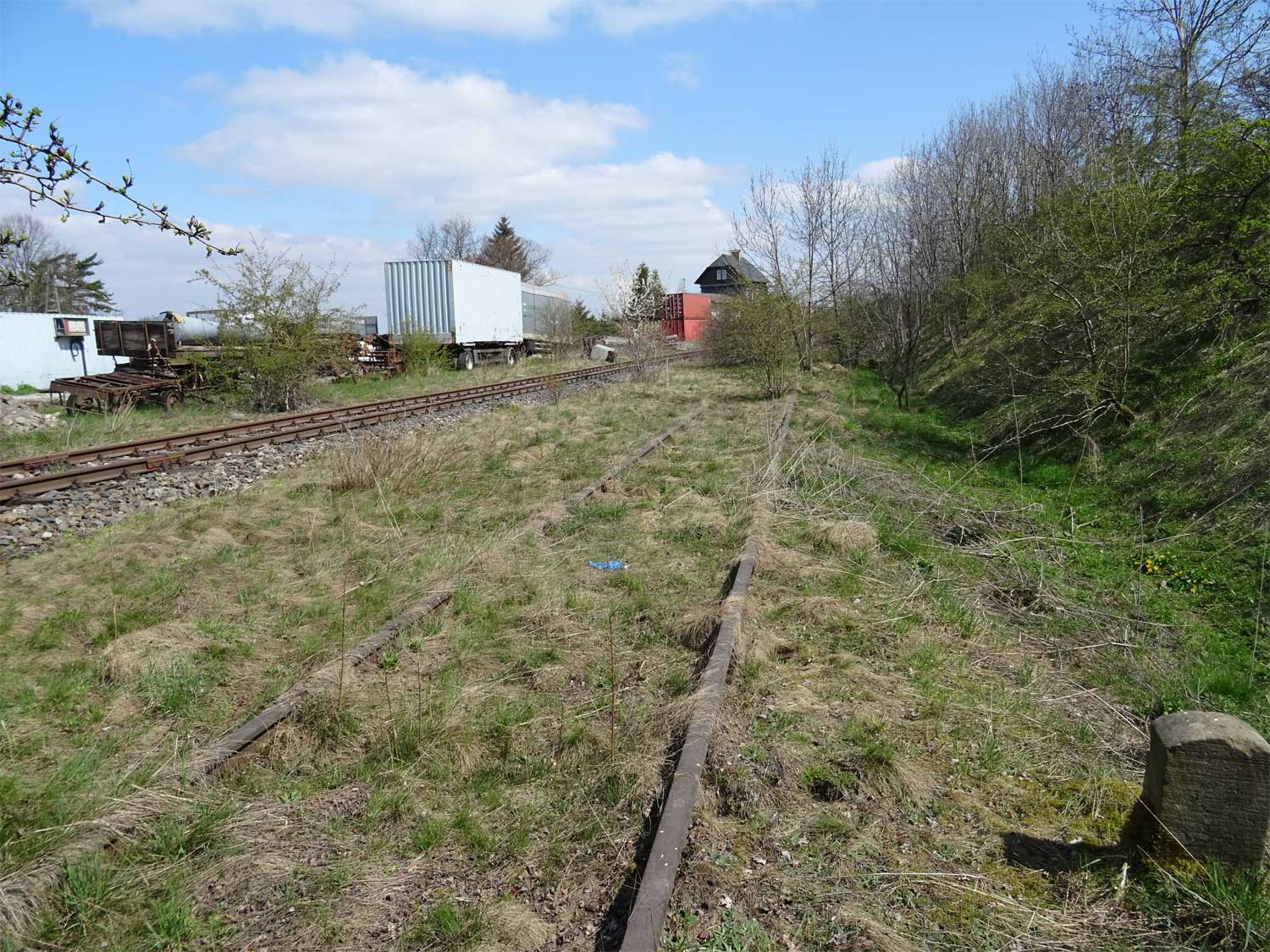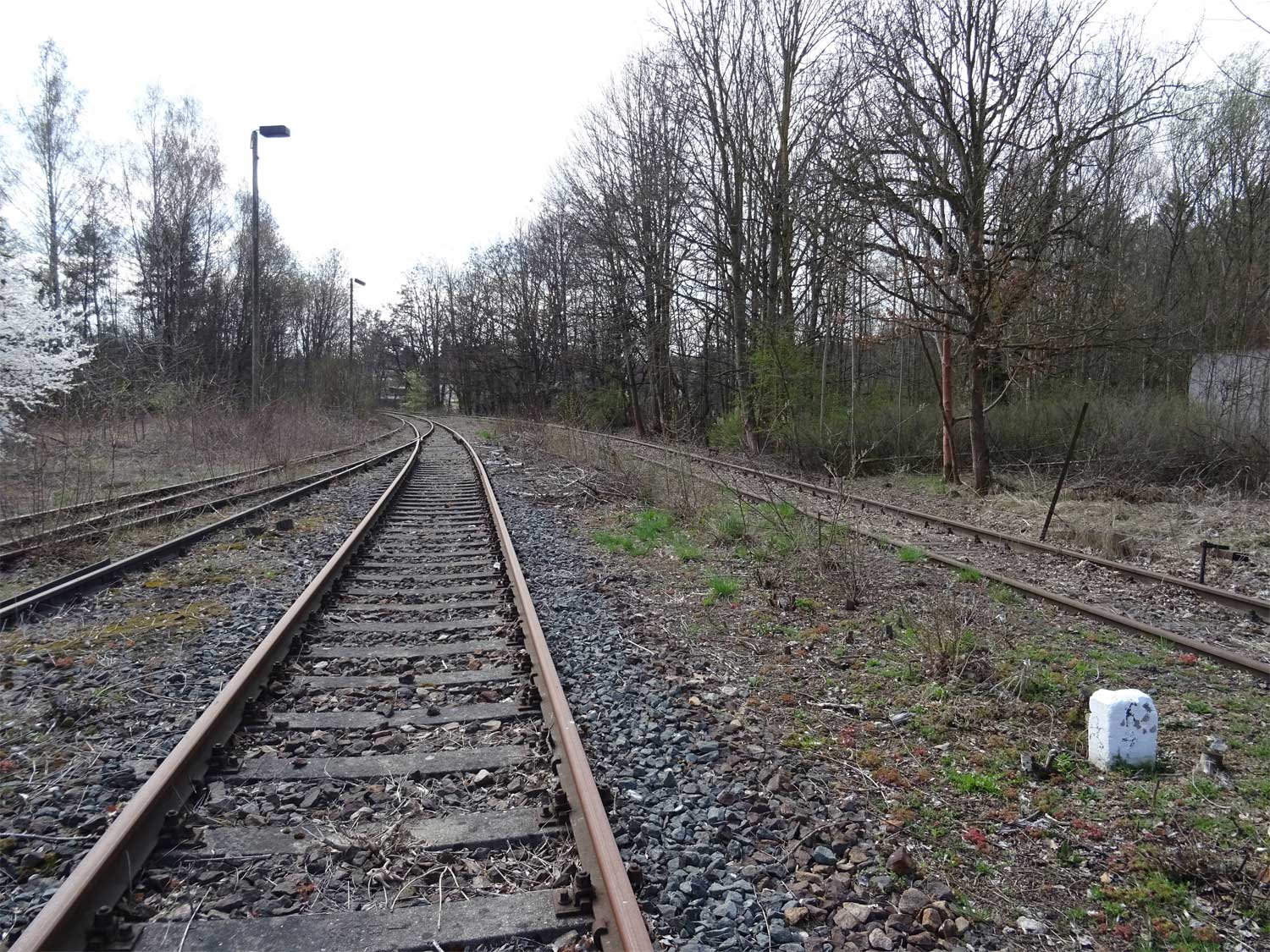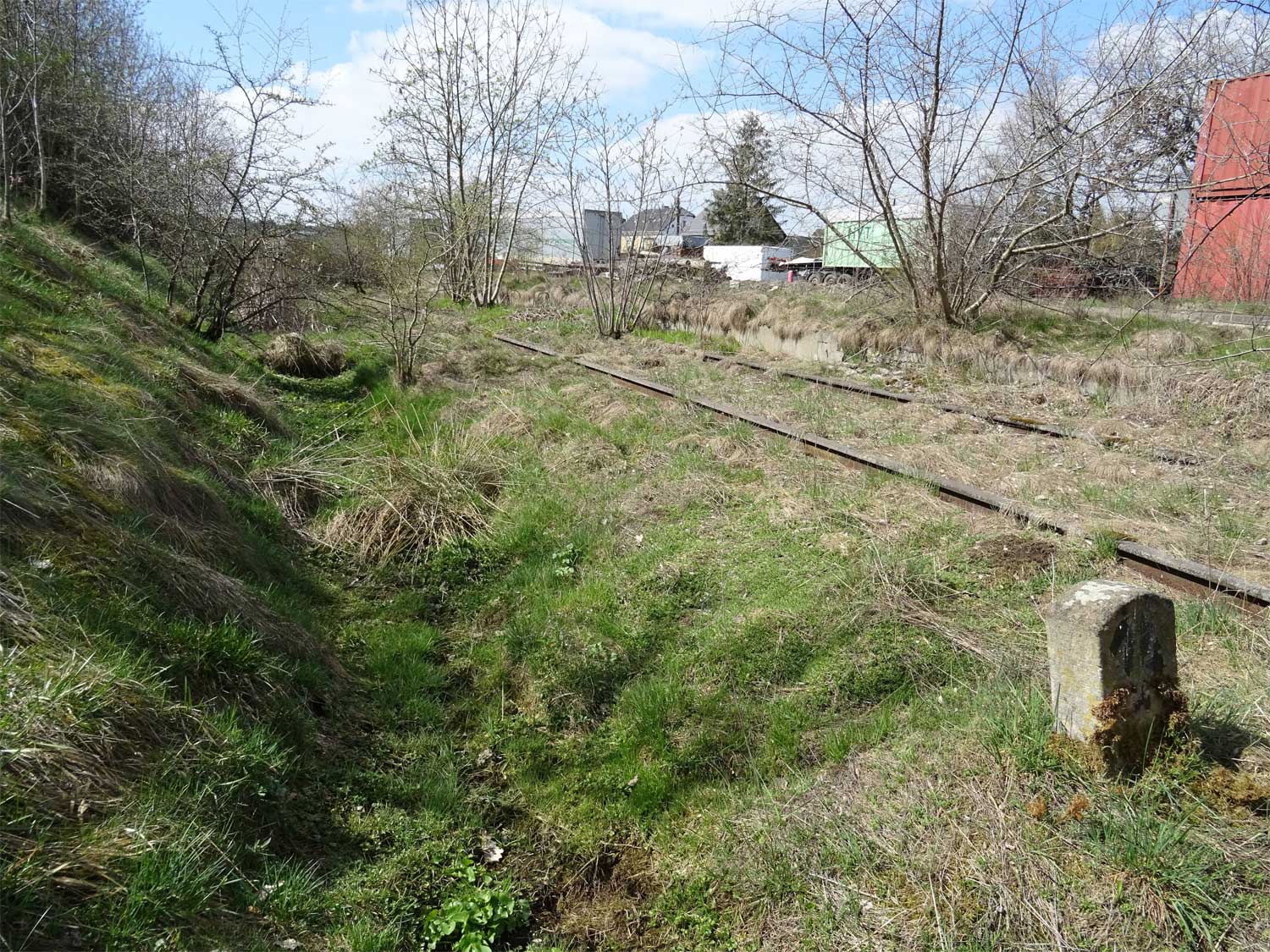 Hier beginnt nach links das ehemalige Planum des Überholungsgleises.